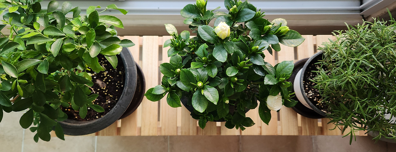 얘네들을 데려오고 난 뒤부터 바로 식물 공부도 시작했다. (식물에 대해 아무것도 모르던 내가 식물 공부라니..!) 특히 우리 롱이들 종인 오렌지 자스민, 꽃치자, 로즈마리에 대해서는 더 자세하게 검색해 보았다. 그리고 반려 식물 카페에 가입해서 나와 같은 종을 키우는 분들의 식물들도 보면서 나름 공부하고 있다. 초보 식집사네 집에 와서 얘네들이 고생하는 건 아닌지 걱정되었지만, 걱정이 무색할 만큼 잘 자라주고 있다. 인터넷 검색해서 가장 좋다는 비료와 영양제도 주고, 매일 하루에 1~2번씩 분무기로 물을 뿌려주고, 일주일에 한 번씩 물 샤워를 듬뿍 시켜준다. 베란다에서 아침해가 가장 잘 들어오는 쪽에 식물 선반을 두고 그 위에 화분들을 두었다. 화분 방향도 매일매일 바꿔주고 있다. 통풍이 잘 되라고 방충망만 두고 베란다 문도 늘 열어둔다.