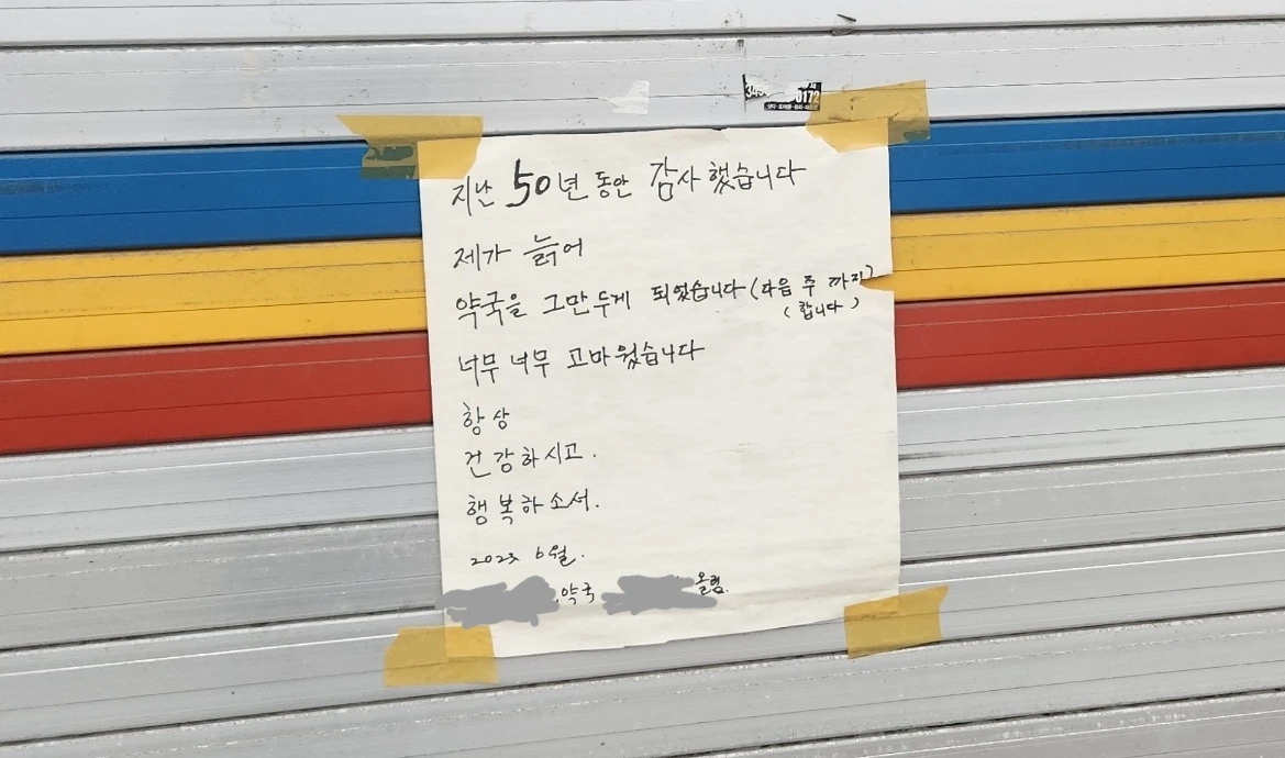 얼마 전 본가에 다녀왔는데 동네 약국의 문이 닫혀있었다. 그리고 약사분께서 쓰신 메모 하나가 붙여져 있는 게 눈에 띄었다. 이 약국도 자주 가진 않았지만 항상 왔다 갔다 하면서 늘 지나치던 약국이었다. 그냥 당연하게 늘 그곳에 있었던 약국. 주변에 가게들도 다 문을 닫고 재개발로 사람들이 다 이사를 가고 공사를 하는데도 홀로 우두커니 서있던 약국. 그 약국도 이제 문을 닫는다 한다. 내 기억으로는 한 20~30년 정도 있었나 싶었는데, 무려 "50년"을 그 자리에서만 계속 약국을 하셨다고 한다.