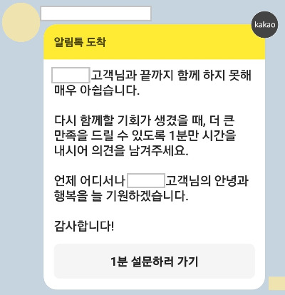 회사는 장기간 계약을 유지하는 금융상품을 판매하다 보니 처음 인연을 맺고 수년 후 계약 해지나 만기 시에 고객들에게 정중하게 굿바이 인사를 한다. 또다시 고객이 되어줄 것을 기대하거나 지인에게 추천해 줄 것을 기대하며 그동안 감사했다고 인사하고, 만족도 조사를 통해 마지막까지 고객의 소리를 듣는다.