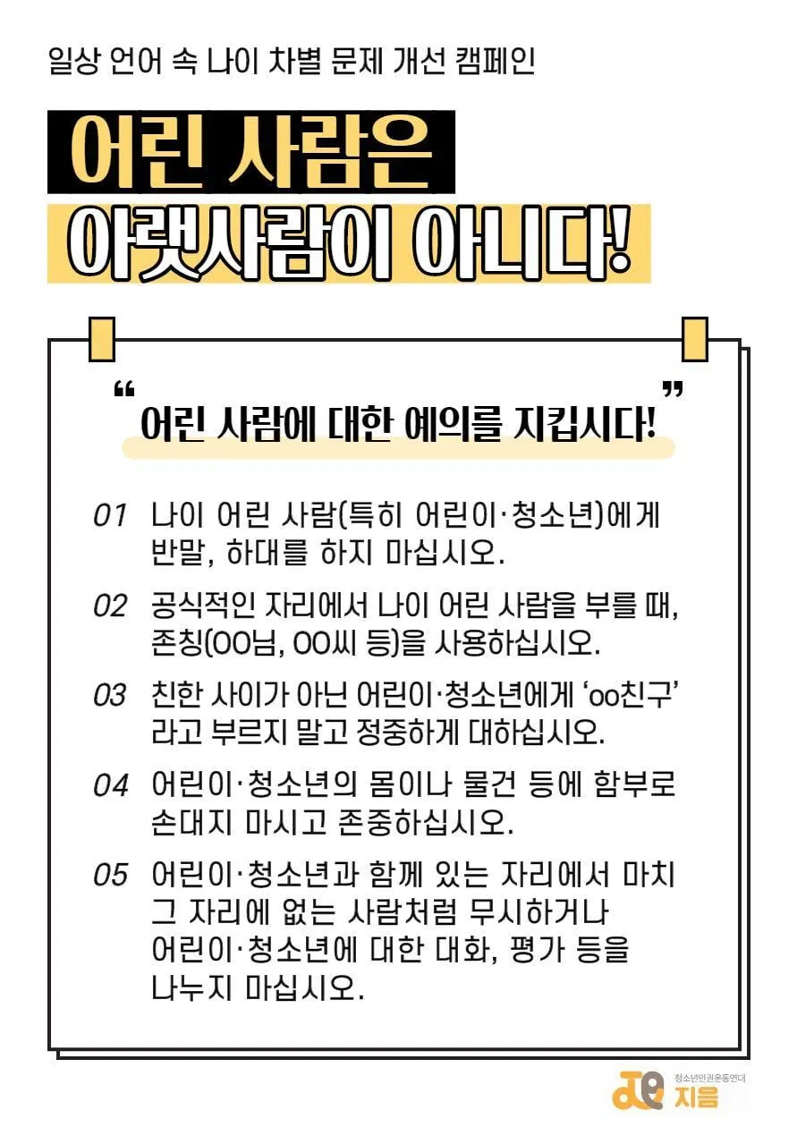 얼마 전 페이스북을 보다가, 한 포스팅을 보게 되었다. "어린 사람은 아랫사람이 아니다"라는 글이었다. 일상 언어 속 나이 차별 문제 개선 캠페인의 일환으로 진행된 포스팅 글에서 우리 대부분이 행하고 있는 것에 대해서 다시 한번 상기시키는 글이었다. 나도 이러한 글을 보면서 나 스스로도 청소년을 위한 일을 하고 있으며, 현장에서 일을 하고 있지만, 과연 청소년을 존중하면서 일을 하고 있냐고 물음을 하게 된 글이었다.