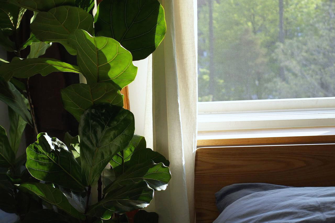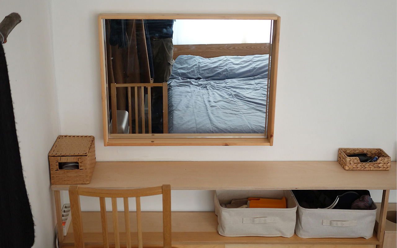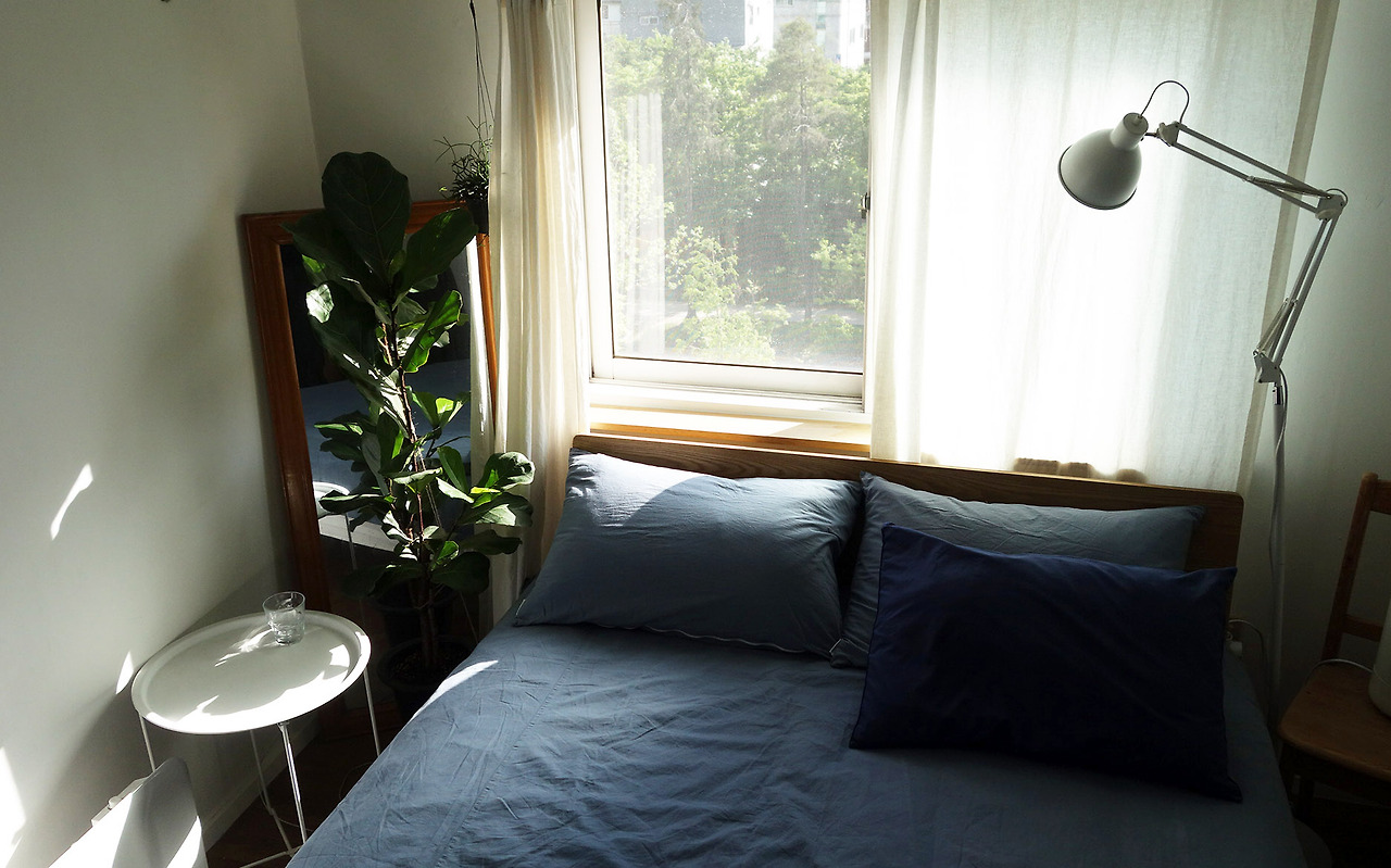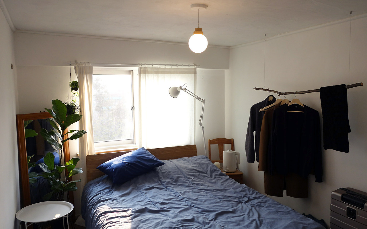 거실이나 서재와 마찬가지로 벽지를 뜯고 바닥에 마루를 까는 과정은 같았다. 하지만 이곳의 외풍 때문에 페인트만 칠해서는 마무리할 수 없었고 단열재와 석고보드로 벽을 보강했다. 중앙에는 더블 사이즈 침대를 놓았고 방문이 있는 벽에는 화장대를 만들어 놓았다. 마지막으로 식물을 들여 놓으니 이제 집 같은 편안한 느낌이 든다.
