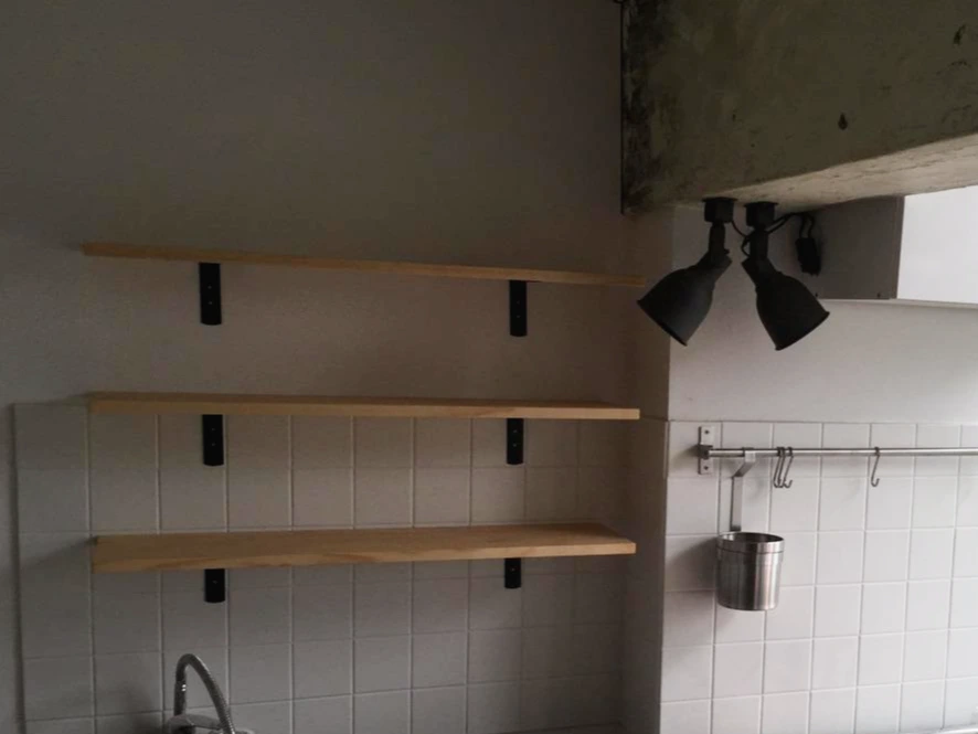 상부장을 떼어낸 자리에는 나무 선반을 달았고 요리할 때 보조등으로 사용할 수 있게 레일조명을 달았다.
