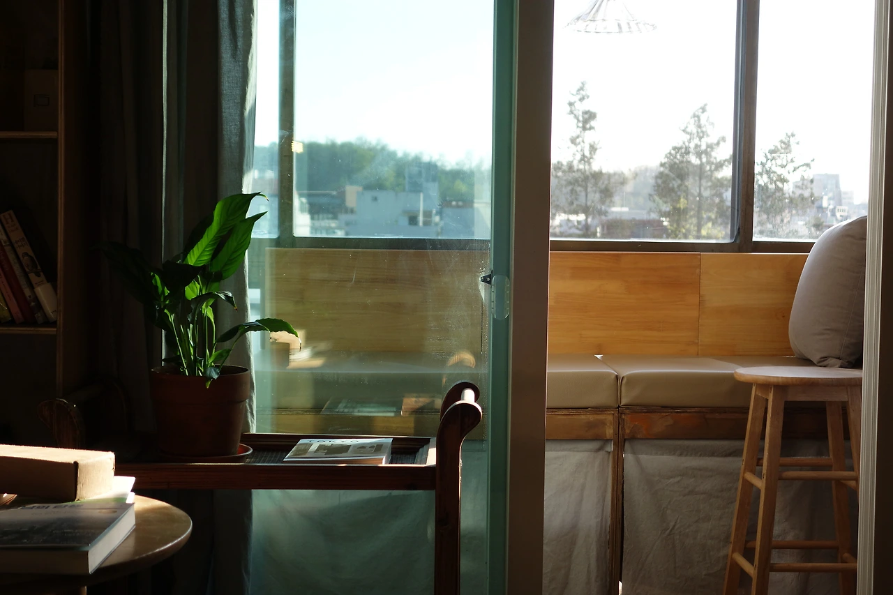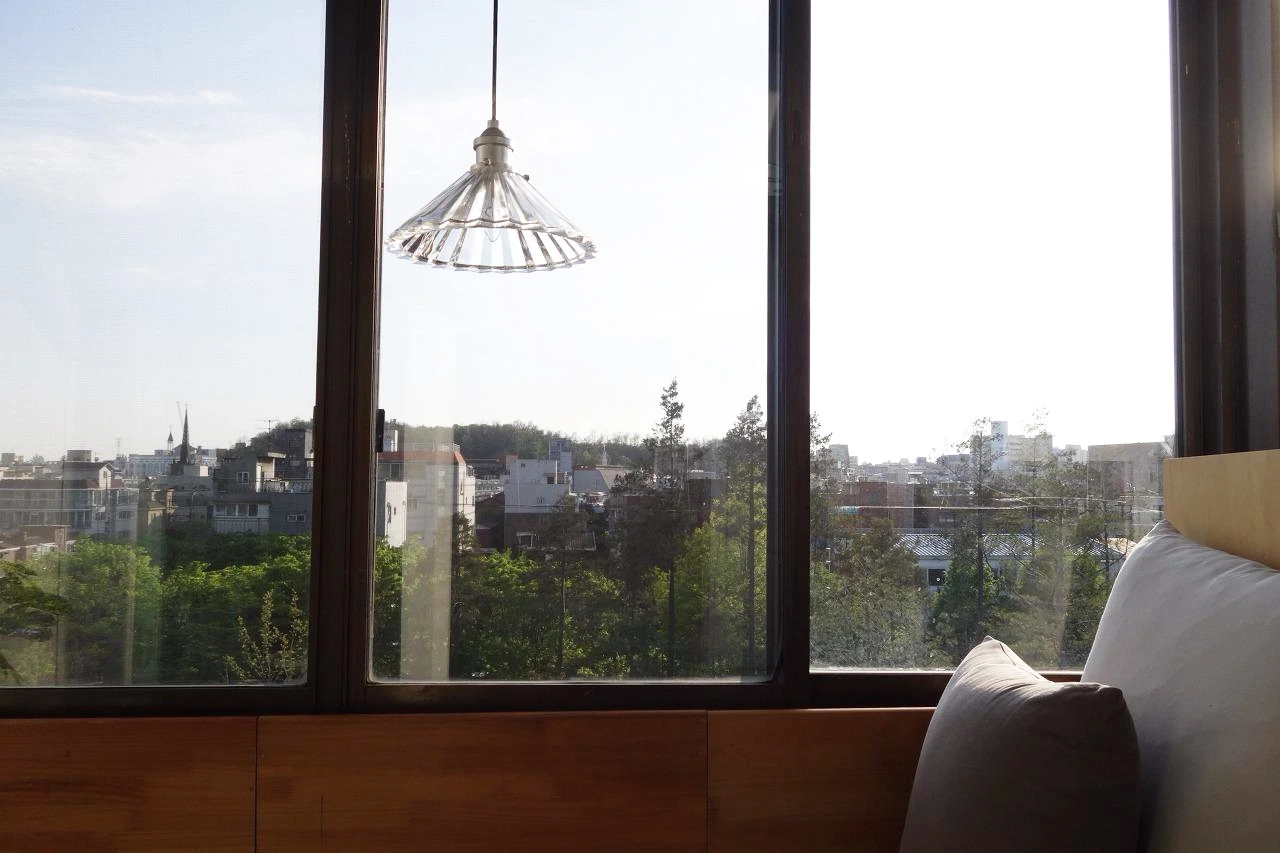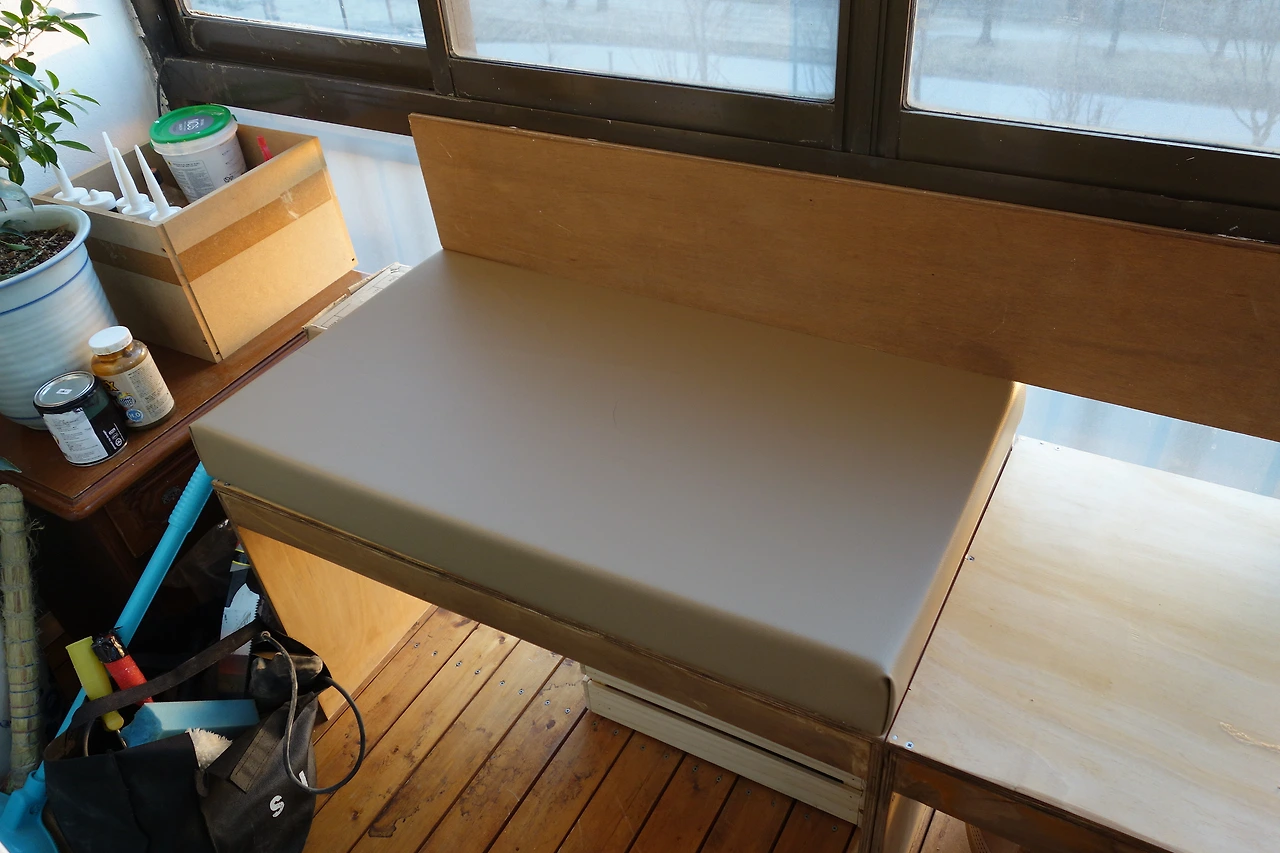 베란다에는 벤치 겸 소파를 만들었다. 수납 공간이 부족해서 밑에 창고로 쓸 공간을 두었는데 이 때문에 전체적이 모양이 좀 망가졌다. 하지만 편안하고 공원이 잘 보여서 책 읽으며 쉬기에 좋다.
