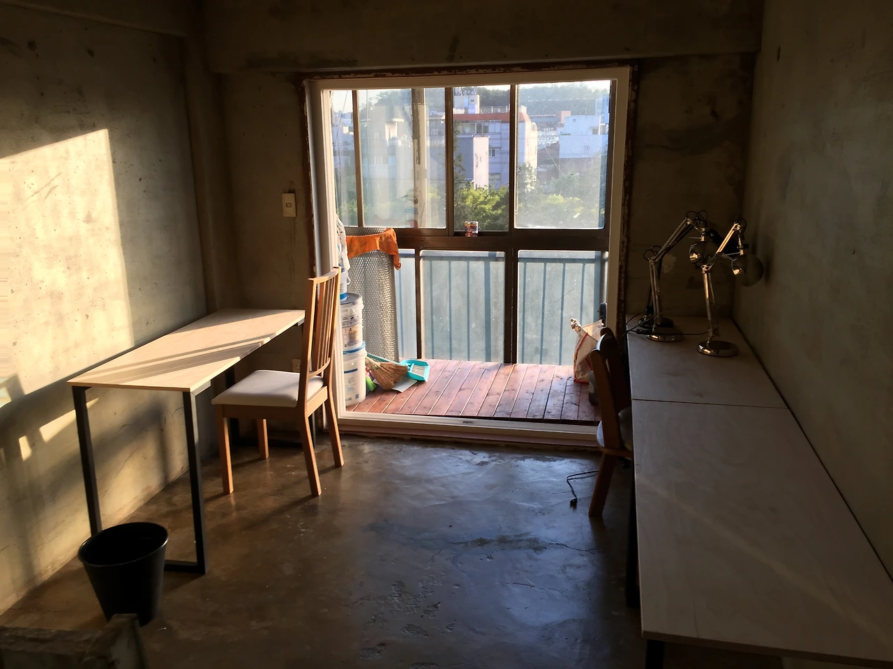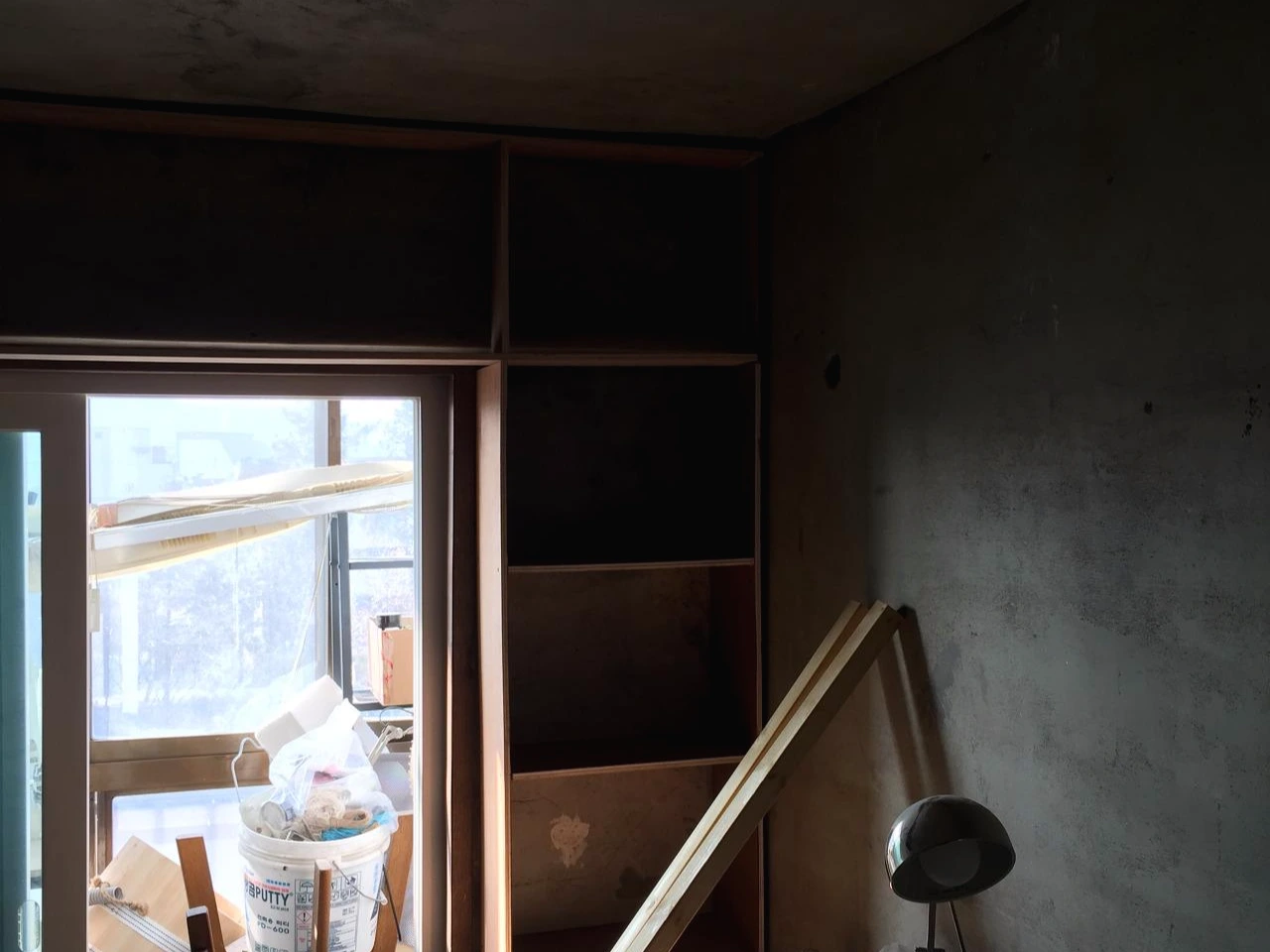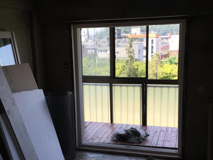공간만 보면 4평 남짓하지만 공원이 보이는 베란다가 있었다. 창고처럼 쓰이던 베란다를 활용하면 재미 있을 것 같았다. 이 공간은 일도 하고 책도 읽는 서재로 만들어보려고 한다. 아파트에는 좀 생소하지만 당시 유행하던 노출 콘크리트와 에폭시 시공을 했다.