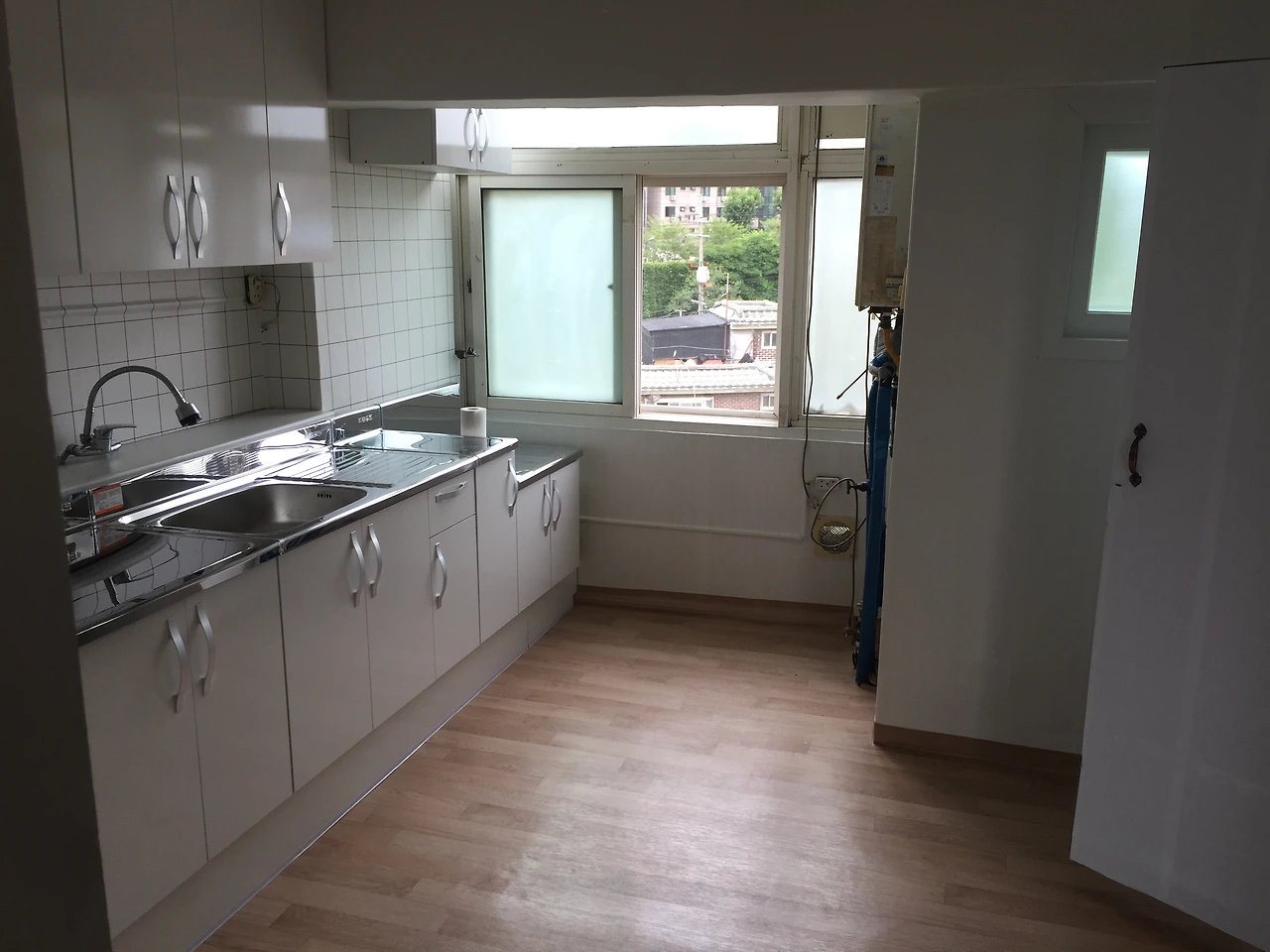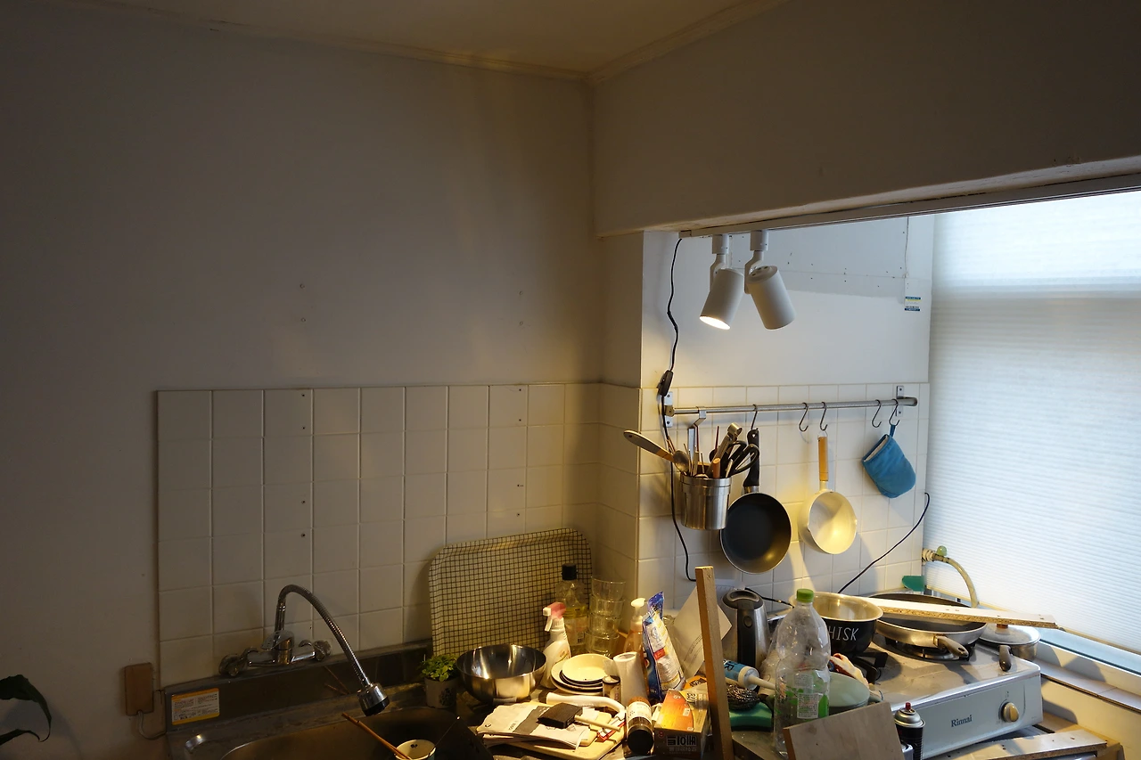 분명 낮에 바람불고 햇빛이 좋을 때는꽤 괜찮아 보였는데 밤이 되고 형광등을 켜니 허술한 점이 구석구석 모습을 드러낸다. 오래된 집이라 벽 표면이 고르지 않아 벽지가 군데 군데 울고 있었다. 벽지에는 인공적인 광택과 보일 듯 말듯 미세한 스트라이프가 있었다. 장판은 얼룩이 많고 가장자리를 따라 허술하게 마감되어 있었다. 싱크대와 상부장의 부피는 너무 커서 집 전체를 더 답답하게 만들었다.
