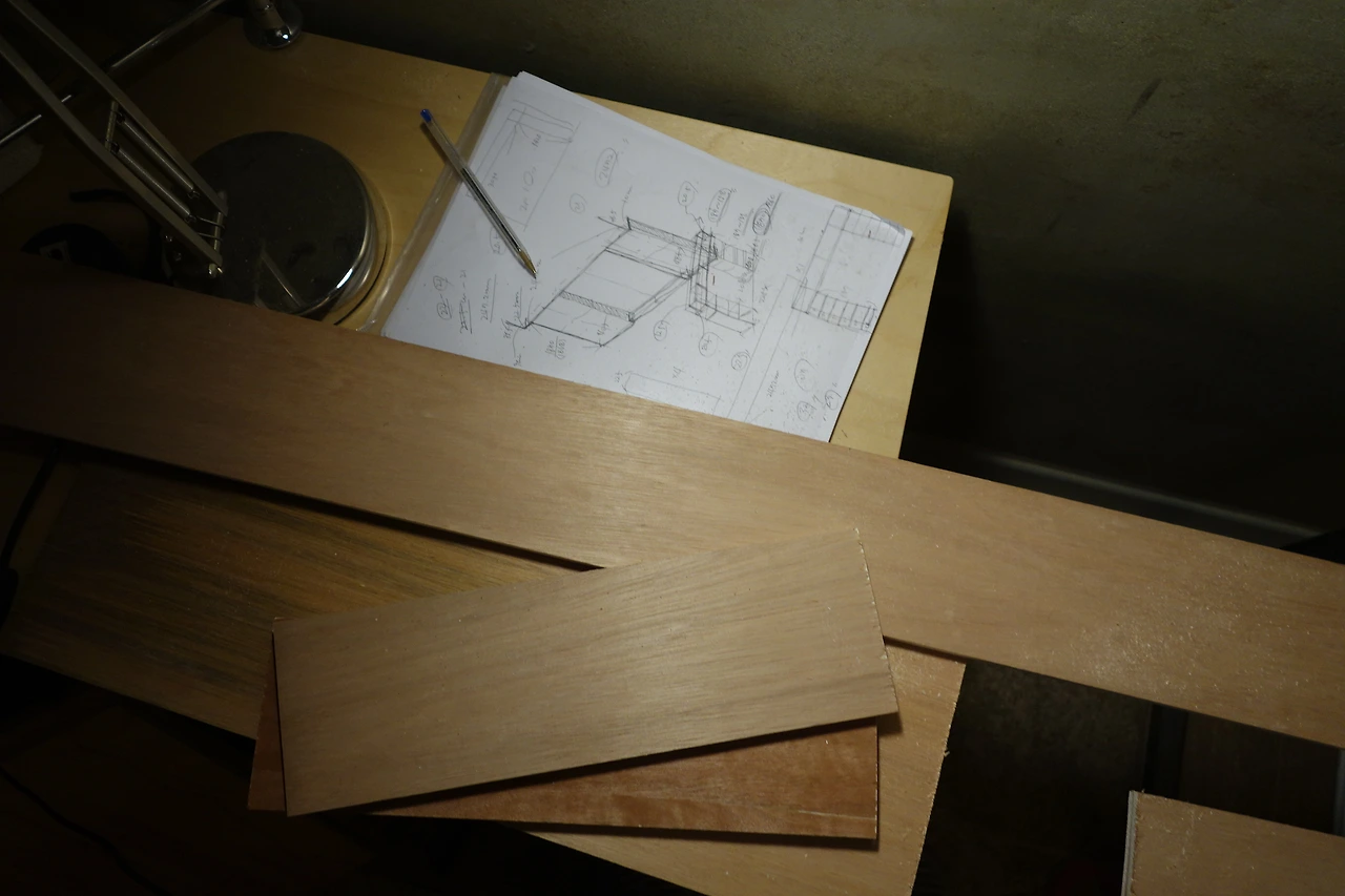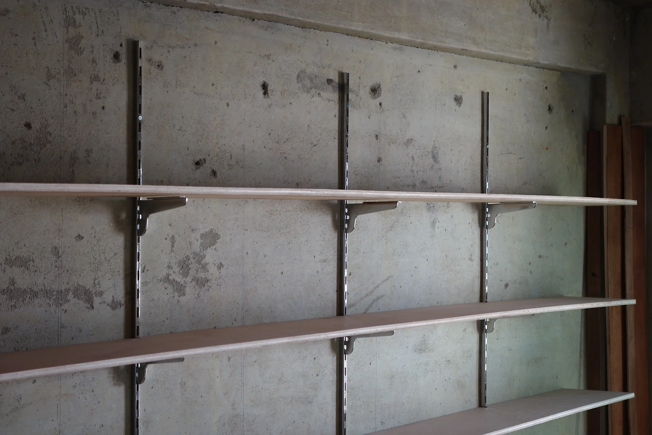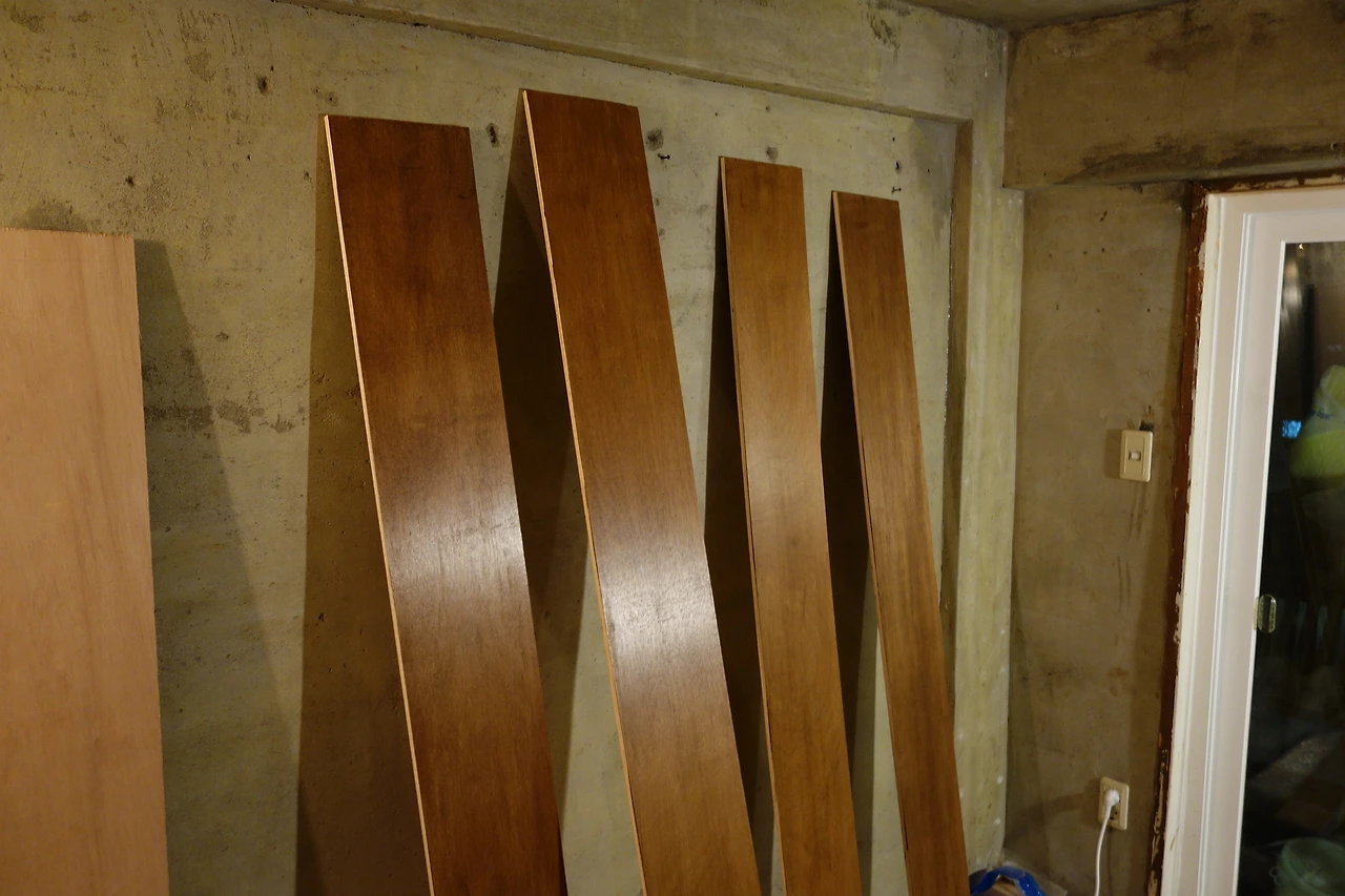 원목 책장을 만들고 싶었지만 공간이 너무 좁아게 느껴질 것 같아 상대적으로 가벼운 느낌의 찬넬을 달았다. 좁은 방이 더 좁아보일까봐 걱정이 되서 선반 깊이는 22cm정도로 최대한 줄였다. 나무는 합판을 재단해 받았고 어두운 컬러의 스테인으로 마감했다.