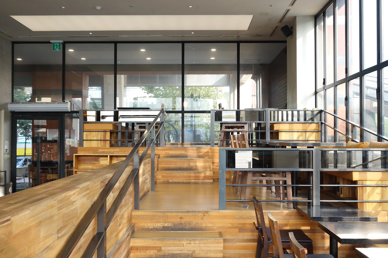 공간에서 느껴지는 첫 인상은 넓고, 밝고, 책이 많다는 것 이었다. 4면 중 3면에 큰 유리창이 나 있어서 아침에는 기분좋은 빛이 실내에 가득하다. 본관 창가쪽에는 계단마다 층고를 달리 자리잡은 테이블이 있다. 앉는 곳마다 뷰(view)가 달라져 흥미롭다. 관련 인터뷰를 찾아보니 카페꼼마는 유럽의 노천카페를 모티브로 디자인 된 공간이라고 하던데 여름철 유리창을 열어놓을때면 정말 그런 기분이 든다.