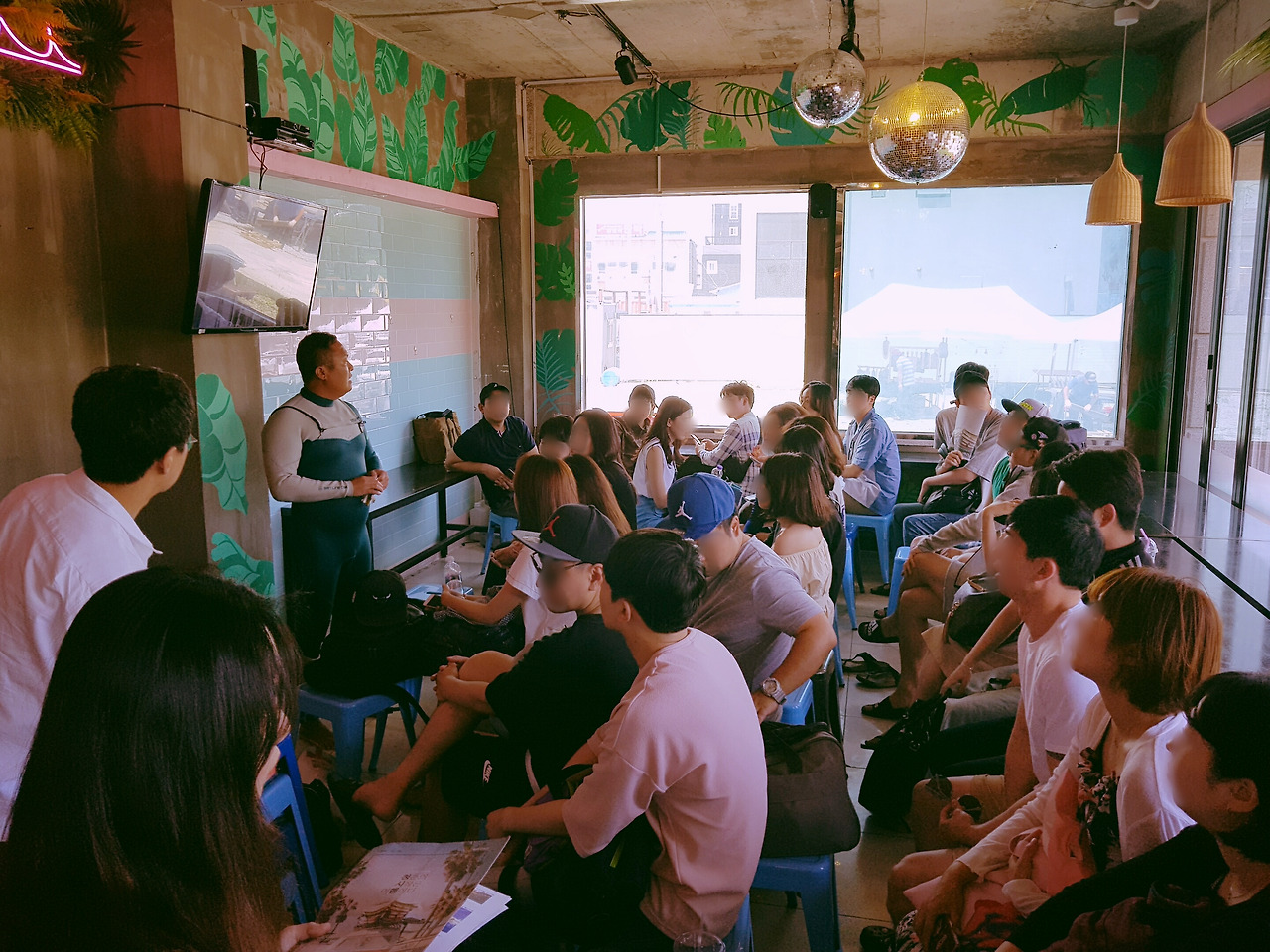 게스트 하우스 분위기가 맘에 들었다. 서핑 느낌 물씬ㅎ 강사님도 사람 냄새 솔솔. 20분 정도 영상강의를 들었다. 특히, 서핑 에티켓이 인상 깊었다.