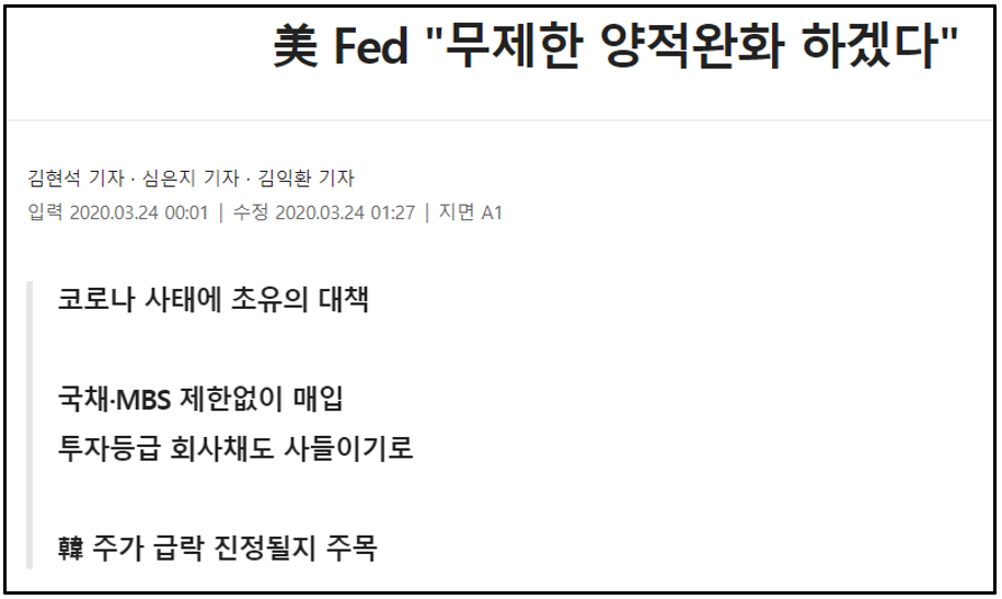 "무제한 양적완화를 시작하겠다", 미국 중앙은행 연준은 미국의 국채와 주택저당증권(MBS)을 '제한 없이' 무제한으로 매입하게 됩니다.