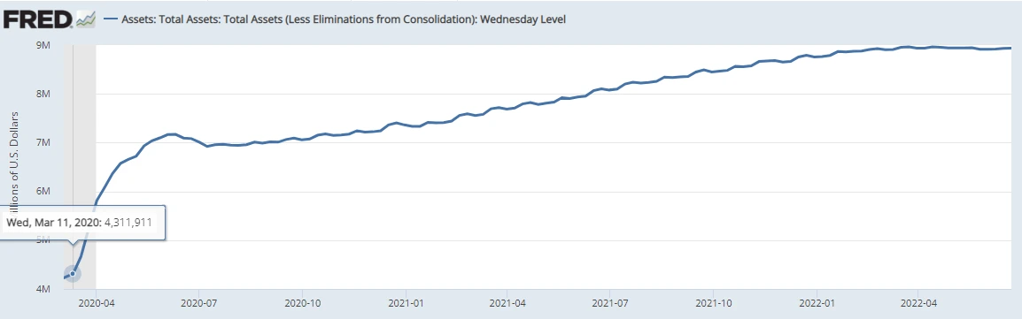 그리고 2년이 지난 2022년 6월 22일 연준의 자산은 8조 9천억 달러로 1경 원을 넘어서게 되었죠. 2년 동안 2배나 자산이 불어난 것입니다.