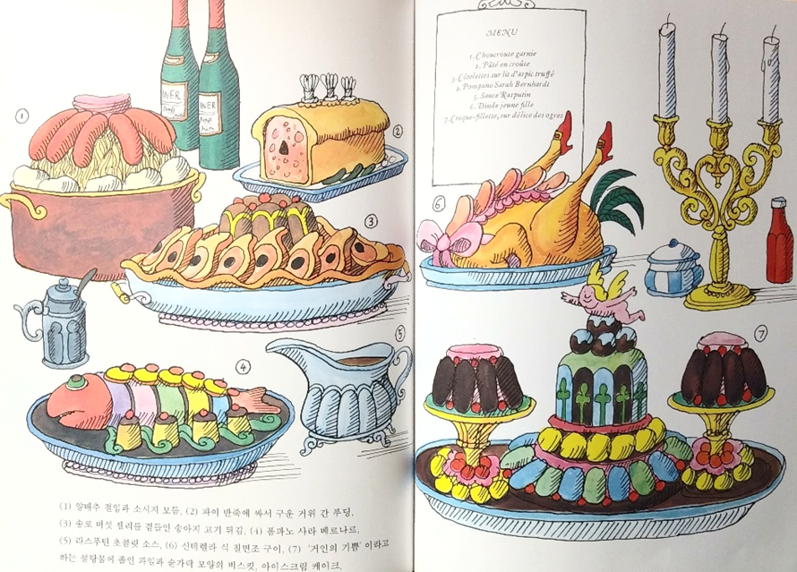 등 요리 하나하나에 개성 있는 이름이 붙은, 제랄다가 만든 요리가 가득 차려진 장면은 특히 이 그림책의 백미로 꼽을 수 있다.