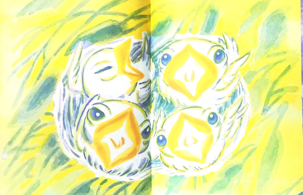 이윽고 네 개의 알이 탄생하고, 아기새가 부화한다.