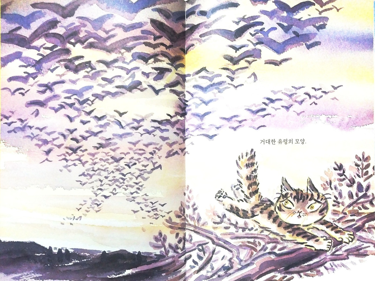 엄마 아빠가 자리를 비운 사이 수많은 새떼가 “거대한 유령의 모양”으로 나타나 고양이를 몰아낸다. 이때의 새떼는 어디서 나타난 것일까? 어쩌면 그 어딘가로 이동하는 철새 떼 무리일 수도 있다. 아니면 우연히 저녁 무렵 집으로 돌아가는 새들의 무리일 수도 있다. 때마침 거대한 유령 모양을 한 새떼가 모습을 나타내준 덕분에 아기 새 네 마리는 무사히 살아남는다. 마치 이 장면은 웅대한 집단 무의식과 우주적 세계관 속에서 아기 새들이 보호받고 있는 듯한 느낌마저 들게 한다.