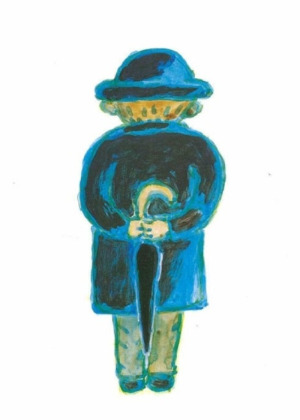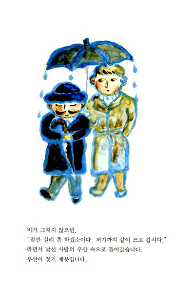 검정 모자, 검정 외투, 검정 신발, 그리고 검정 우산까지. 정말이지 중무장을 한 모습이다. 이런 아저씨에 비해 같이 쓰자고 우산을 가리킨 해맑은 어린 소년의 옷차림은 가볍기만 하다.