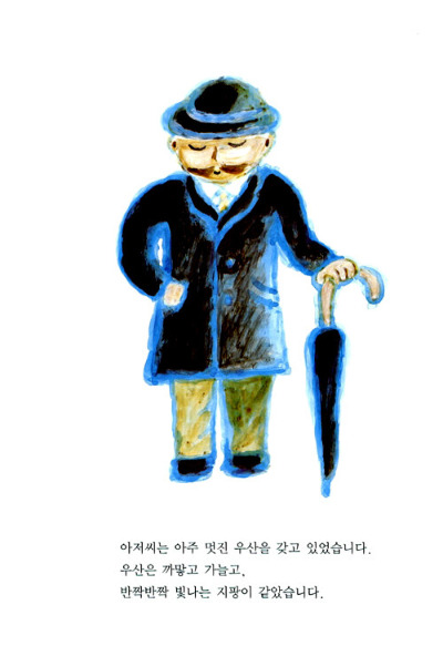 아저씨가 우산을 들고 있다. 표지에서도, 속표지에서도, 첫 장면에서도 아저씨는 우산을 들고 있다. 아저씨의 우산은 “까맣고 가늘고, 반짝반짝” 빛이 난다.