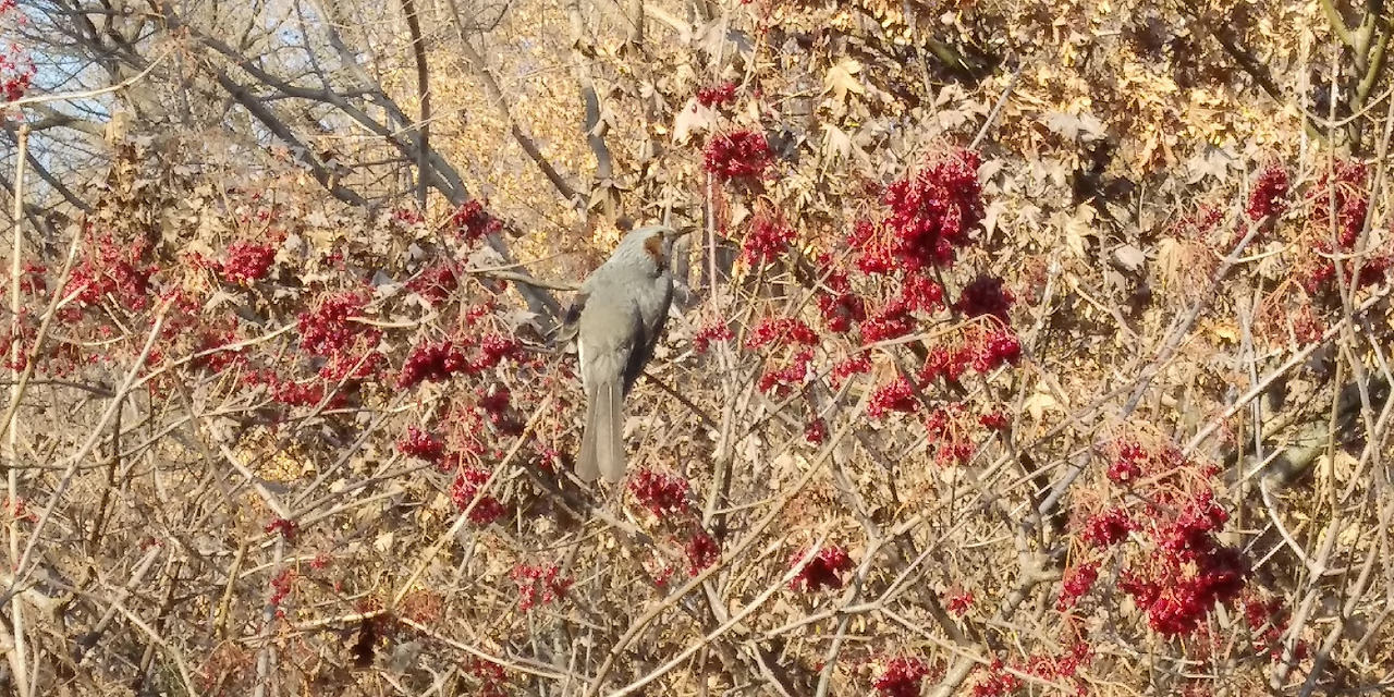 이름 모를 빨간 열매를 먹고 있는 직박구리도 만났다. 직박구리 두 마리가 술래잡기를 하듯 요란스럽게 서로를 쫒고, 열매를 먹고, 어디론가 날아갔다가 다시 와 열매를 먹는다.