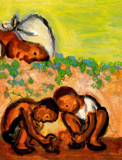 그림책에서 클라이맥스는 피난길에서 밤을 맞아 고향집에 두고 온 강냉이를 떠올리는 소년의 상상 장면일 것이다. 소년은 형이 구덩이를 파고 자신이 강냉이 씨를 떨어뜨리고 엄마가 흙을 덮어 자신의 키만큼 쑥쑥 자란 옥수수를 별빛 빛나는 검푸른 밤에 생각한다.