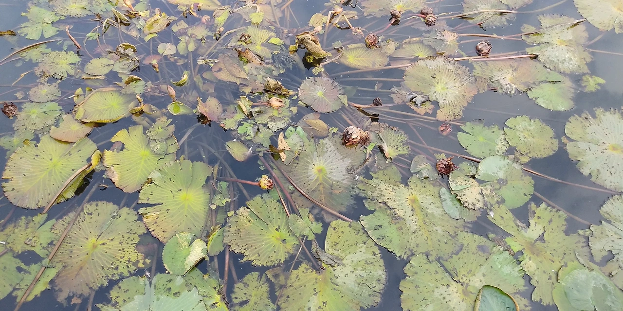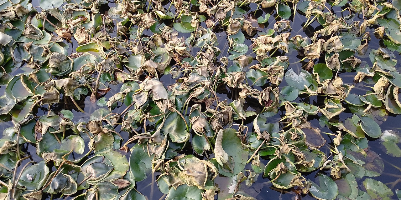 연못의 수련도 막 피다가 얼어붙은 모습이었고, 파릇파릇 생기 있던 잎사귀도 마치 강한 햇빛이나 불에 탄 것처럼 냉해로 축 처져 있었다.