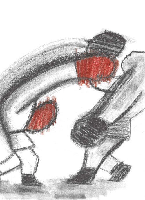 빨간 권투 글러브를 낀 선수가 힘차게 잽을 날려보지만 검정 글러브를 낀 다부진 상대 선수는 가볍게 피한다. 산을 오르다가 “커다란 바위를 만났”을 때처럼 상대 선수의 강렬한 어퍼컷이 턱을 강타한다. ‘웅덩이’와 ‘가파른 언덕’을 지나듯 연달아 검정 글러브를 낀 선수의 강렬한 펀치가 작렬하고 그림책 표지의 주인공인 빨간 글러브 선수는 그로기 상태가 되어 쓰러진다.