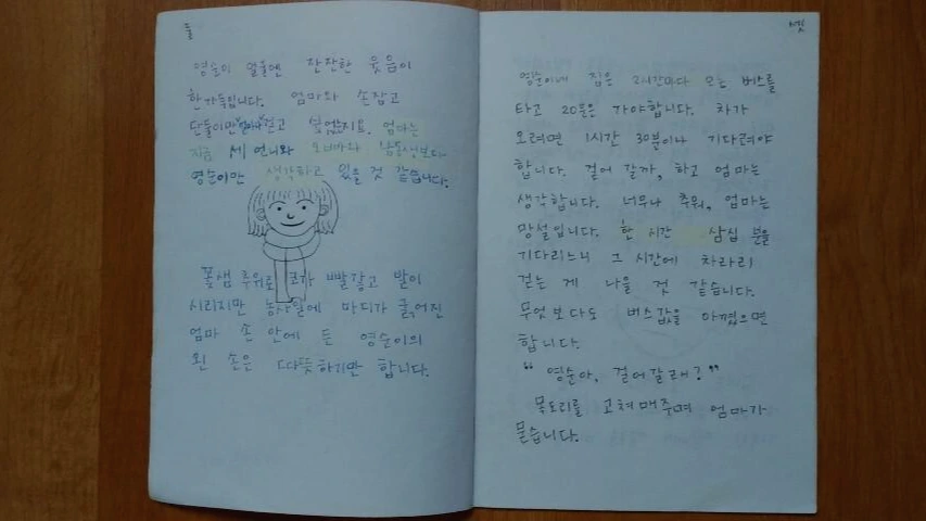 영순이네 집은 2시간마다 오는 버스를 타고 20분은 가야 합니다. 차가 오려면 1시간 30분이나 기다려야 합니다. 걸어갈까, 하고 엄마는 생각합니다. 너무나 추워, 엄마는 망설입니다. 한 시간 삼십 분을 기다리느니 그 시간에 차라리 걷는 게 나을 것 같습니다.