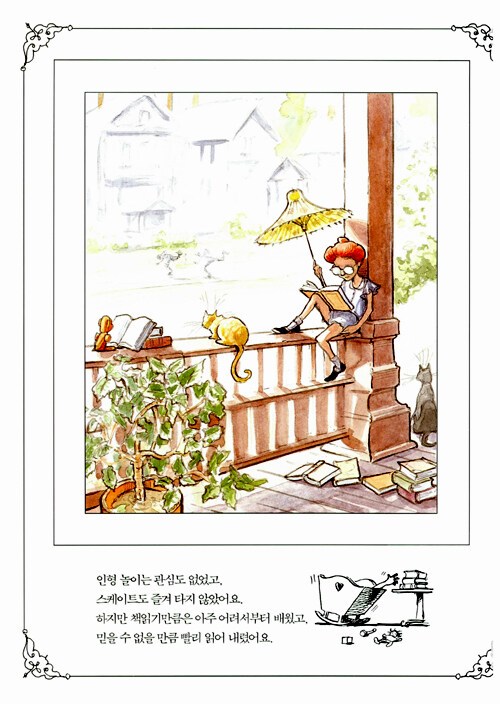 그림책에서는 자세히 나오지 않지만 엘리자베스 브라운은 아무래도 유산이 있었나 보다. 아니면 책을 통한 그 풍부한 지식을 바탕으로 학생들을 가르치는 일타 강사였나보다. 그림책에서 엘리자베스 브라운은 기숙 학교를 다녔고 기차를 타고 가다가 길을 잃고 잘못 내린 곳에서 정착해 집을 마련하고 아이들을 가르치며 생활했다고 나온다. 그곳에서 소문난 강사 생활을 하셨나보다. 어찌되었거나 태생부터가 책을 읽고, 사고, 모을 수 있는 특성과 조건을 갖춘 인물인 것은 틀림없다.