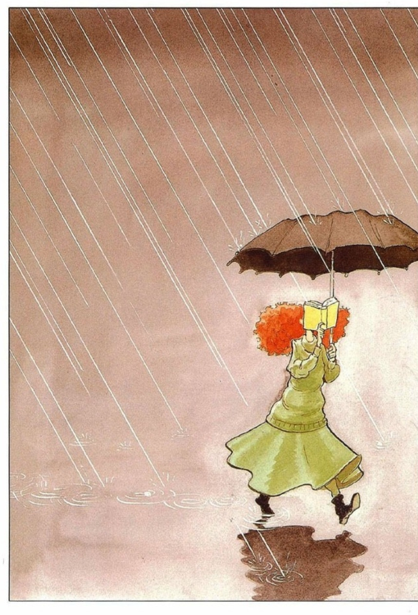 비 오는 날 우산을 쓴 채 책으로 얼굴을 가리고 엘리자베스 브라운이 길을 간다. 빗방울이 빨간 머리카락에도, 옷에도, 책에도, 그림자에게까지 내리꽂혀도 개의치 않는다. 책 속에 길이 있다는 말은 더 심오하게 쓰이지 이럴 때 쓰는 말은 아니지만, 마치 책 속에 길이 있듯이 엘리자베스 브라운은 앞을 보지 않고도 발걸음 당당하게 걸어간다. 책이 엘리자베스 브라운의 얼굴을 대신한다. 엘리자베스 브라운에게 책은 그녀의 정체성인 것이다.