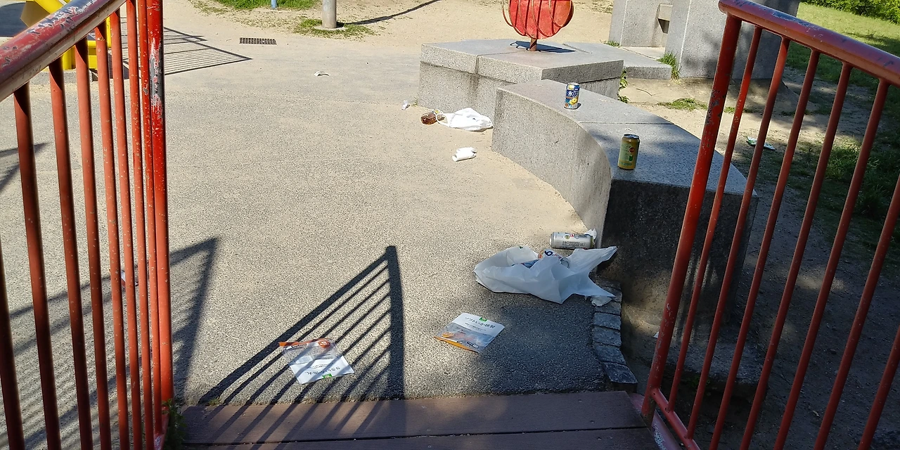 미끄럼틀 가까이로 올라가 보았더니 캔맥주와 안주 봉지로 어지럽다.