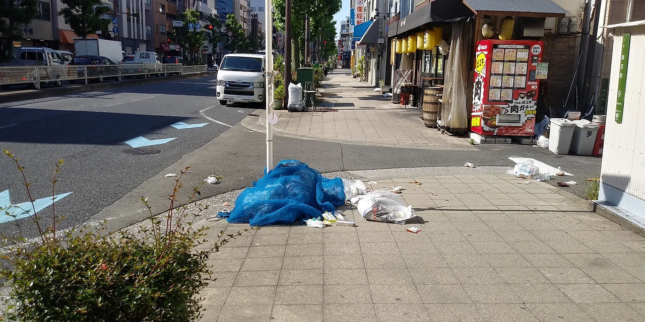 큰길 양 옆으로 작은 골목들이 많았고 건물과 건물이 다닥다닥 붙어있었다. 큰길을 가면서 뒷골목도 하나하나 들여다보면서 걸어가는데 길가에 쓰레기가 흩어져있었다. 아무래도 까마귀의 소행 같다. 그물망으로 덮어놨는데도 이곳저곳이 어질러져있었다.