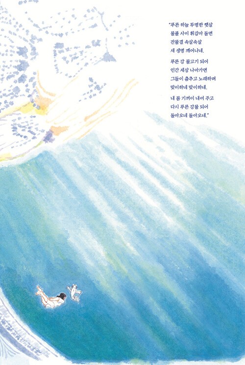 《행복한 붕붕어》의 표지를 보았을 때, 매우 신화적이라는 생각이 들었다. 표지를 열고 면지로 넘어가면 넓고 깊은 파랑이 펼쳐진다. 청정한 하늘 같고 바다 같은 너무나 아름다운 파랑이다.