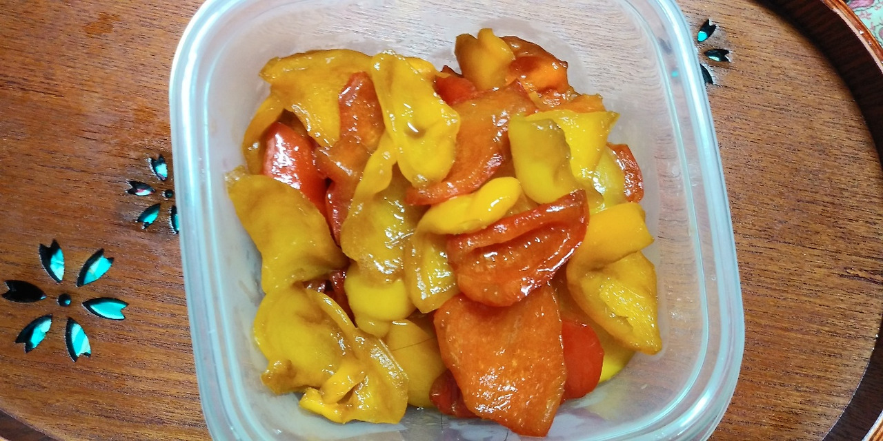 그런데 여기서부터가 좀 특이성이 있다. 이렇게 볶은 피망 요리는 바로 먹는 것이 아닌 반찬통에 담아 하루 동안이나, 반나절 정도 냉장고에 넣어두었다 먹으면 제맛이다.