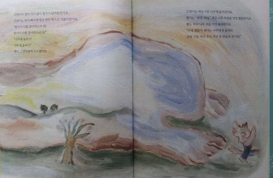고양이는 뱀과 헤어져 다시 길을 나서고, 바로 ‘뭔가’를 만난다. 그림책에서 가장 난해하고 가장 중요한 장면이 등장한 것이다. ‘뭔가’가 고양이를 향해 달려들고, 질겁한 고양이는 “뭔가가 나를 잡아먹으러 와!”소리치며, “꽁지 빠지게 방금 왔던 쪽으로”도망을 친다. 그리고 이때 또다시 뱀이 등장한다.