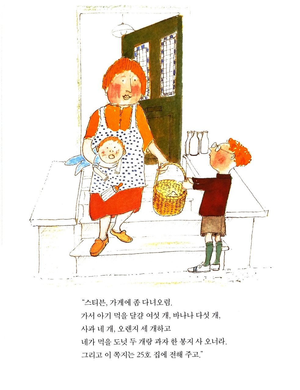 “아기 먹을 달걀 여섯 개, 바나나 다섯 개, 사과 네 개, 오렌지 세 개 하고 네가 먹을 도넛 두 개랑 과자 한 봉지 사 오너라. 그리고 이 쪽지는 25호 집에 전해 주고.”