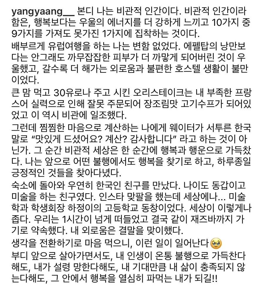 그래도 어제 마주한 에펠탑은 환상이었다. 무슨 천운으로 한국인 룸메이트를 만나서 안전하게 야경을 볼 수 있었다니. 찾으려고 하면 또 행복과 행운이 함께 하는 순간들도 존재한다. 그저 내가 어떤 시각으로 보는지에 달렸을 뿐. 연습이 필요하다. 긍정적이고 낙관적인 사람이 되는 연습. 어떤 불행보다 찾기 힘든 행복을 스스로 찾아내는 법을 터득하자!