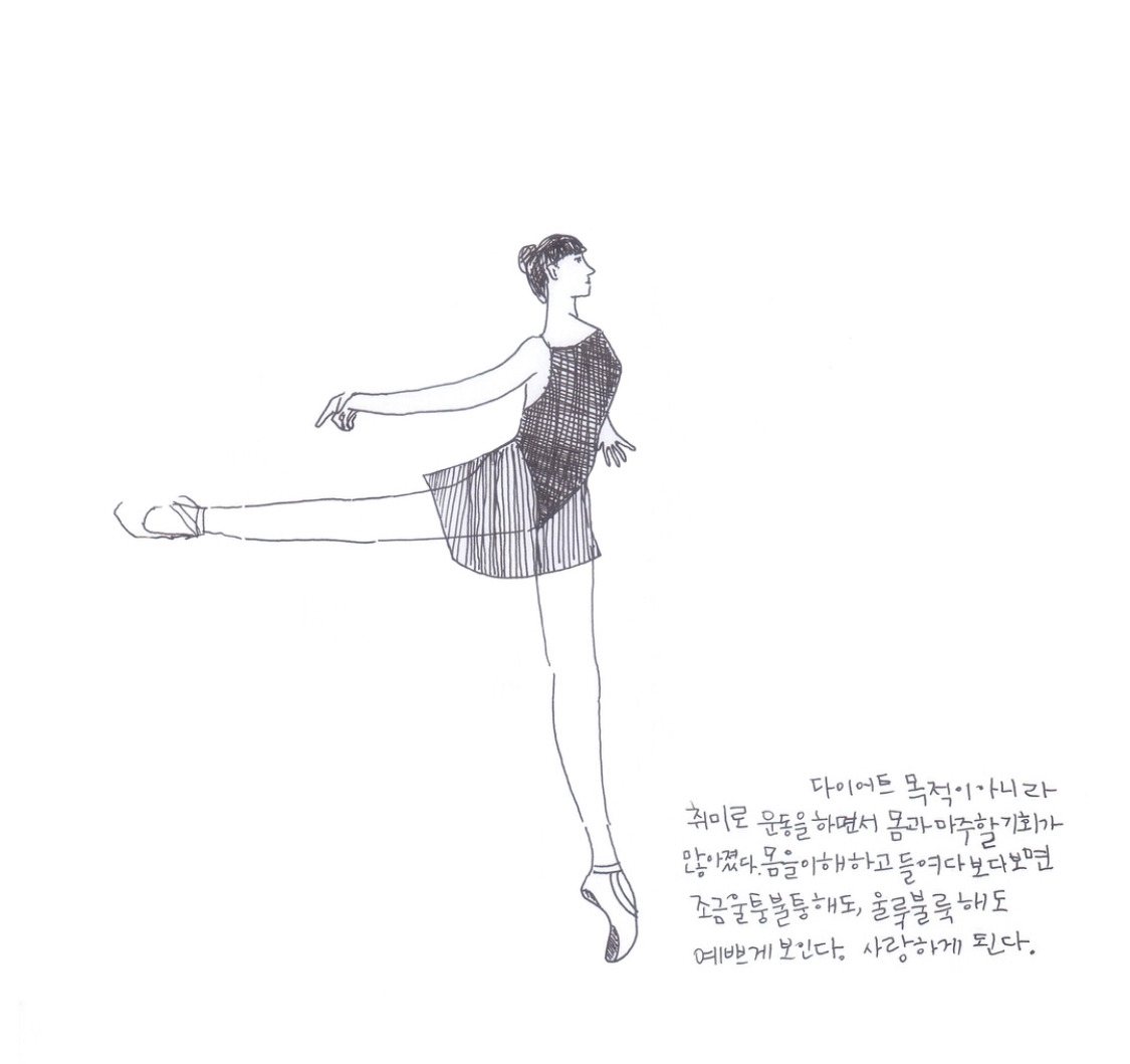 그런데도 필라테스 학원의 문을 두드린 건 다 체형 때문이다. 출산 후 체형이 달라졌다고 느꼈다. 넉넉해진 뱃살은 둘째 치고, 골반과 갈비뼈가 넓어져 옷을 입어도 묘하게 태가 달랐다. 다시 발레를 해볼까 고민하다가 필라테스를 추천받았다. 한번 배워보고 아님 말지 뭐. 그렇게 덜컥 주 2회 3개월 수강권을 끊었다.