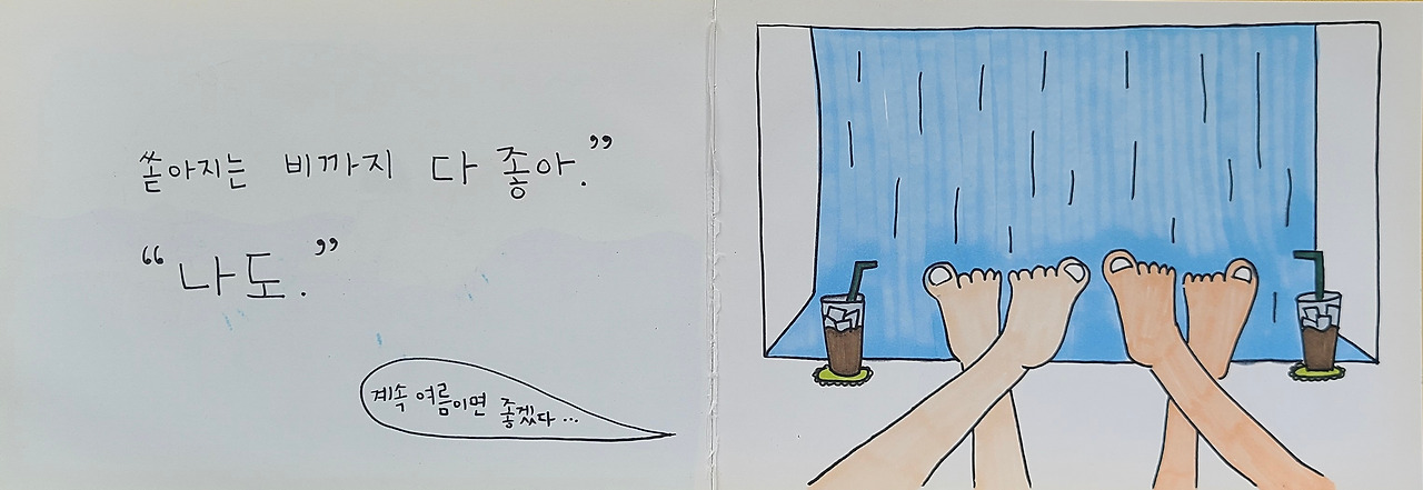 알록달록한 여름의 예쁜 얼굴만 사랑하는가 하면, 갑자기 쏟아지는 소나기나 장마 기간의 꿉꿉함, 숨 막히는 습기, 타 들어갈 듯한 볕, 뭐 하나 살랑살랑, 슬렁슬렁하지 않고 무자비한 계절이라는 점도 사랑한다. 봄, 가을을 좋아하지만 어쩐지 ‘사랑한다’고 하기엔 부족하다. 사랑한다는 말 안에는 못 견디게 힘들지만 ‘그럼에도 불구하고’의 마음이 있는 것 같다고 생각했다.