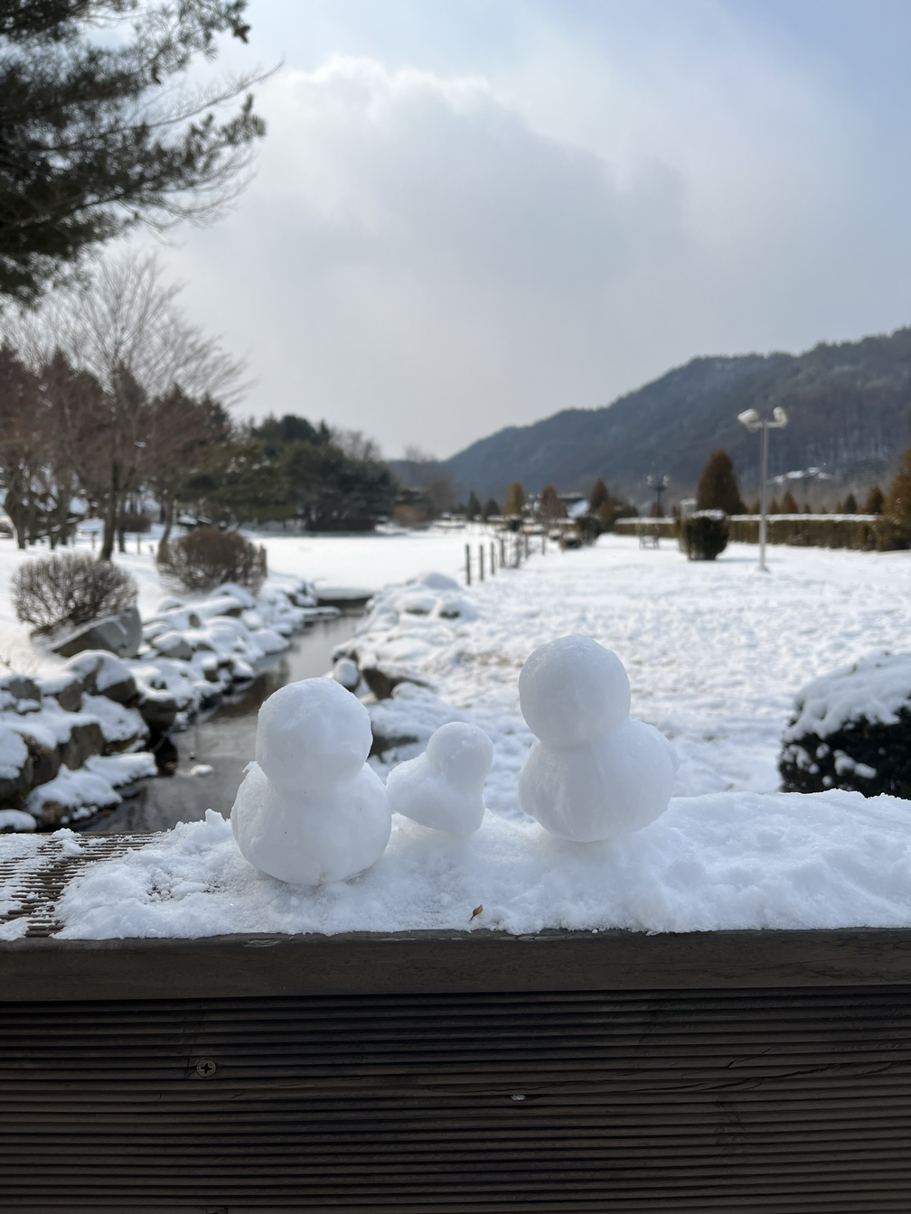 마지막 날 눈이 내렸다. 아주 펑펑. 눈 예보가 있었던가. 아기 침대, 아기 밥 같은 걸 신경 쓰느라 제대로 확인하지 못했는데, 밤사이 온 세상이 하얗게 덮였다. 조식을 든든히 먹고, 아이를 꽁꽁 싸매고 나가서 냅다 눈밭에 던졌다. 그리고 나도 벌러덩. 눈밭에서 뒹군 게 얼마만이더라. 눈밭에 개처럼 겅중겅중 뛰다가 옆을 보니 아들이 눈밭에 강아지처럼 쫄랑쫄랑 걷고 있었다.