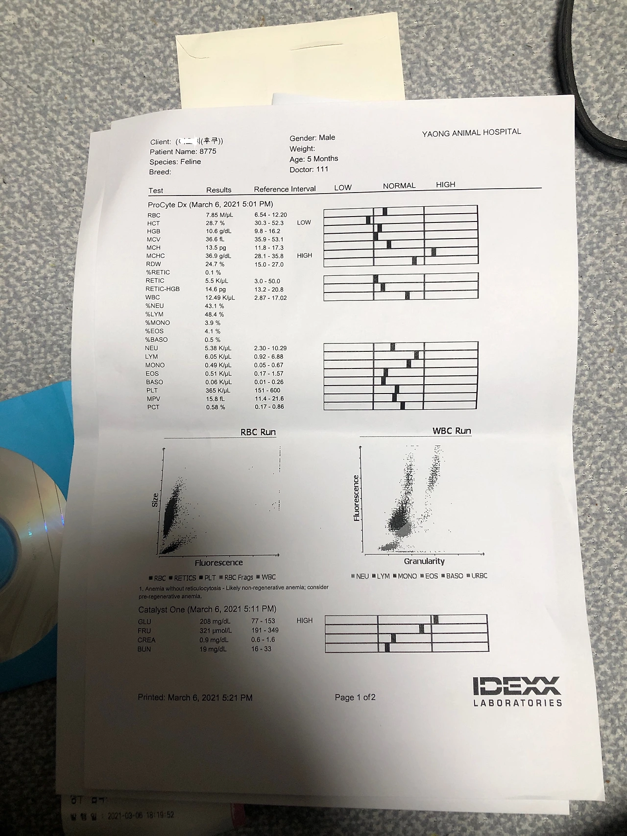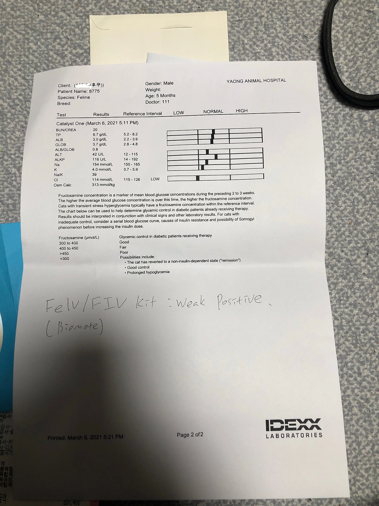 영업이 끝난 병원은 한산했다. 진료실로 들어가 자세한 설명을 들었다. 키트 검사 결과 고양이 백혈병 약한 양성 반응에 빈혈기가 있다고 했다. 키트에 희미한 선이 생겼고 시간이 흘러서 선이 지워졌다고 했다. 그나마 희망인 건 약한 양성이었다는 점이고 고양이 백혈병은 단번에 진단을 내리지 않는다는 점이었다. 설명을 듣다가 결국 나는 참지 못하고 또다시 울었고 수의사 선생님은 휴지를 건넸다.