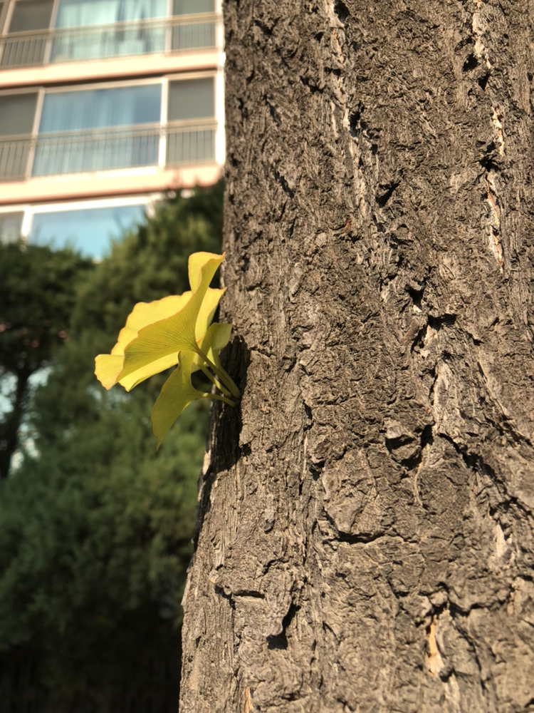 횡단보도로 가는 길에는 은행나무를 심어놨다. 그날도 헐레벌떡 뛰어갔지만 신호를 놓쳐서 인도 주변을 서성이며 돌아다녔다. 오가는 자동차를 보다가 나무를 물끄러미 쳐다봤다. 수많은 결들을 당당하게 드러낸 은행나무를 보는데 줄기에 잎이 나있다. 가지가 없이 은행잎 몇 장이 포개져서 줄기를 뚫고 나와있었다. 신기하다. 신기해하면서 스마트폰을 들이밀어 사진을 찍었다.