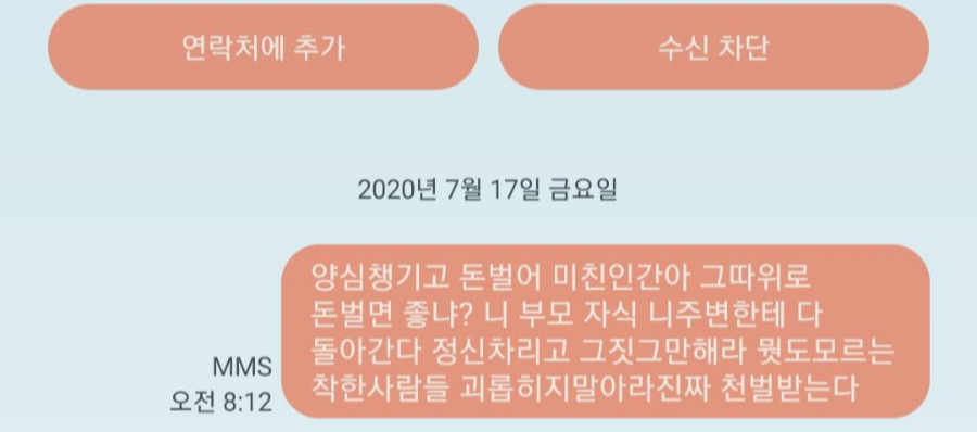 몇 주전 아침부터 언니에게서 톡과 문자 메시지 이미지가 하나 왔다. 자다 일어나 비몽사몽으로 보는데 '미친 인간아'라는 문자 내용에 정신이 번쩍 뜨였다. 아침 댓바람부터 무슨 일인데 욕을 시전 하는 걸까. 무슨 일인지 물어보니 아침부터 보이스피싱이 전화가 왔다나. 못 쏟아낸 게 후회돼서 발신 번호로 문자를 보냈다고 했다. 문자만 봐도 언니가 얼마나 화가 났는지 느껴졌다. 분노한 캐릭터가 한 발로 땅을 구르는 모습이 상상되었다.