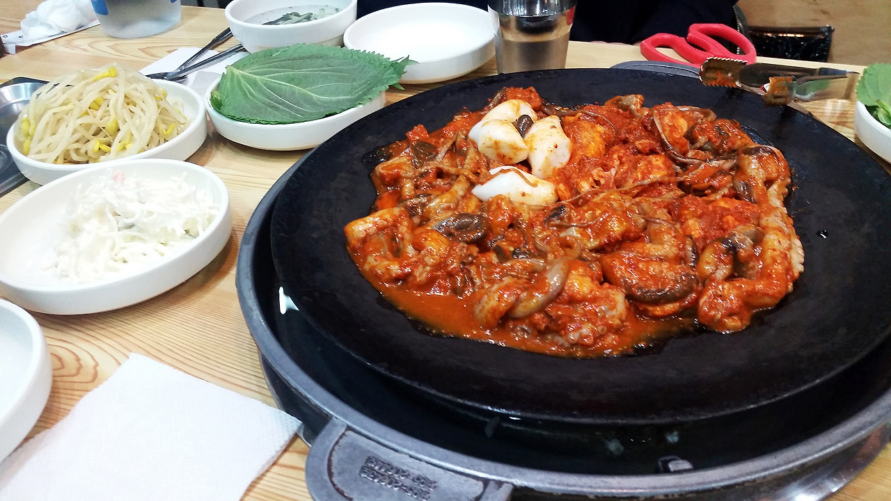 과장이라 느끼는가? 그렇다면 '용두동할매 신쭈꾸미'의 쭈삼을 강력 추천한다. 쭈꾸미와 삼겹살이 불판 위에서 지글지글 익는 동안 콩나물과 미역냉국, 날치알 등을 먹으면서 그날 있었던 경기에 대해 이것저것 이야기하다보면 어느새 쭈삼이 "날 먹어봐요~"라고 자신의 몸을 섹시하게 꼬고 있을 것이다.