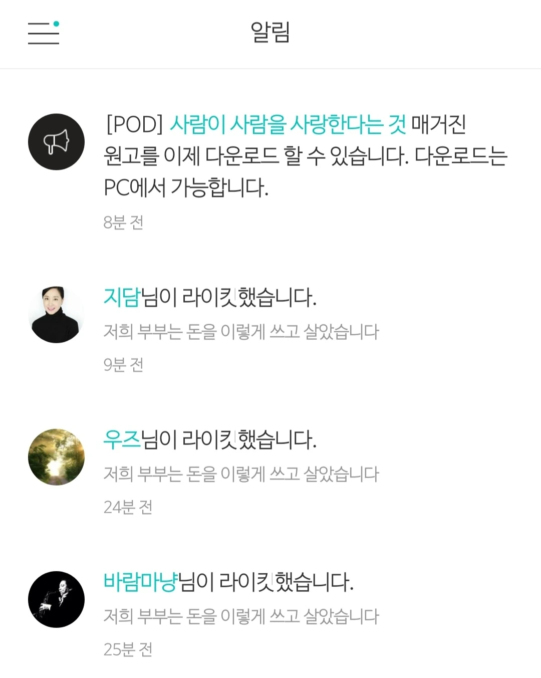 알림, 매거진 원고를 다운로드할 수 있습니다