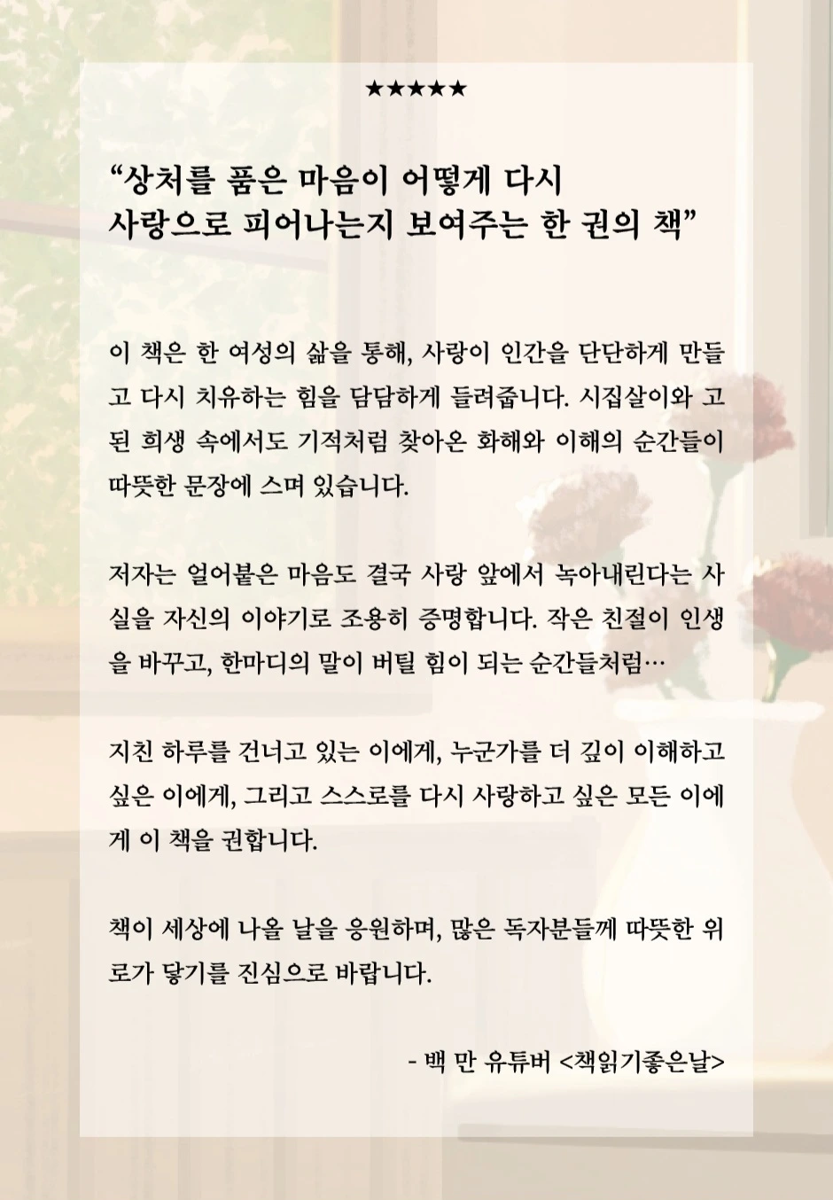 제가 책을 낸다면 낭독을 해주실 거라는 확신은 있었지만, 출판사 대표님의 권유로 추천사를 흔쾌히 써주실 줄은 몰랐습니다.