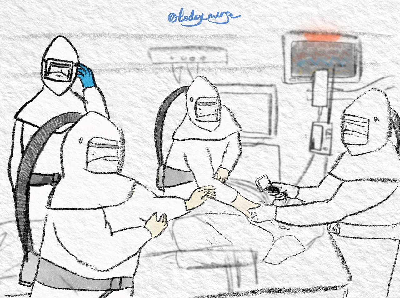 내부에서 서예인 선생님과 팀이 되어 일하던 김진규 선생님은 저 멀리서 그 광경을 보고는 급하게 응급카트를 끌고 자리로 향했다. 때마침 intubation을 하기 위해 주치의가 방호복을 모두 입고 오염존안으로 들어왔다.