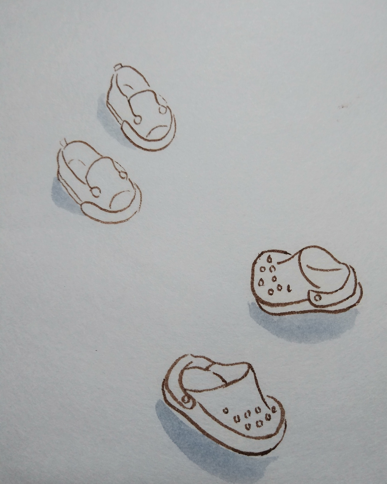 마을 사랑방에 모여 놀고 집에 갈 때면 신발을 찾느라고 댓돌 앞에서 아우성이 일어났을 상상을 해본다. 둔한 사람들은 대충 신고 가버렸을 수도 있고 예민한 사람들은 자기 것에 아주 작게 표식을 해놨을 수도 있겠다. 댓돌 뒤에 살짝 감춰놨을 수도 있지. 아기 신발 그리면서 별별 생각을 다한다.