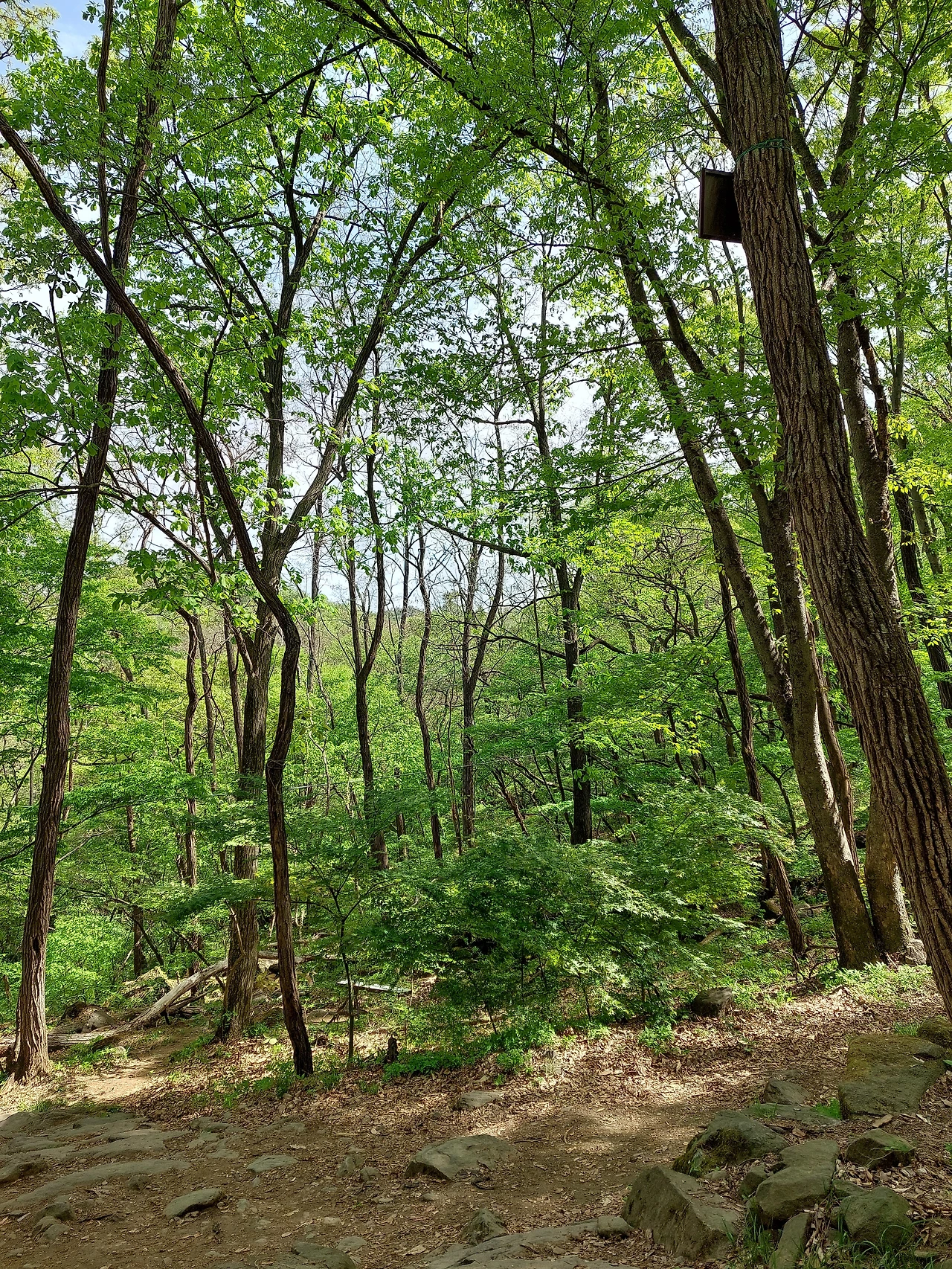 산은 두 주 사이 빽빽하고 풍성해졌다. 2주 전만 해도 듬성듬성 보이던 마른 가지들이 하나도 보이지 않고 넝쿨로 뒤덮였다. 벚나무처럼 보이는데 특이한 꽃이 피었기에 뭔지 궁금해서 사진을 찍었는데 몇 걸음 못 가 다시 그 꽃이 넝쿨로 있는 게 아닌가. 다시 돌아가 나무를 살펴보니 역시 넝쿨이 나무를 타고 올라간 거였다. 으름덩굴이란다.