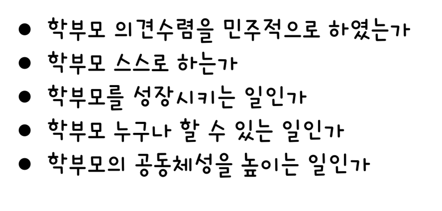 6. 학부모 지원이 꼭 필요한 영역인가, 필요하다면 어떤 지점인가, 그것은 우리 학부모들의 성장에도 도움이 되는가, 활동을 통해 학부모의 교육적 관심이 높아질 수 있는가, 확인한다.