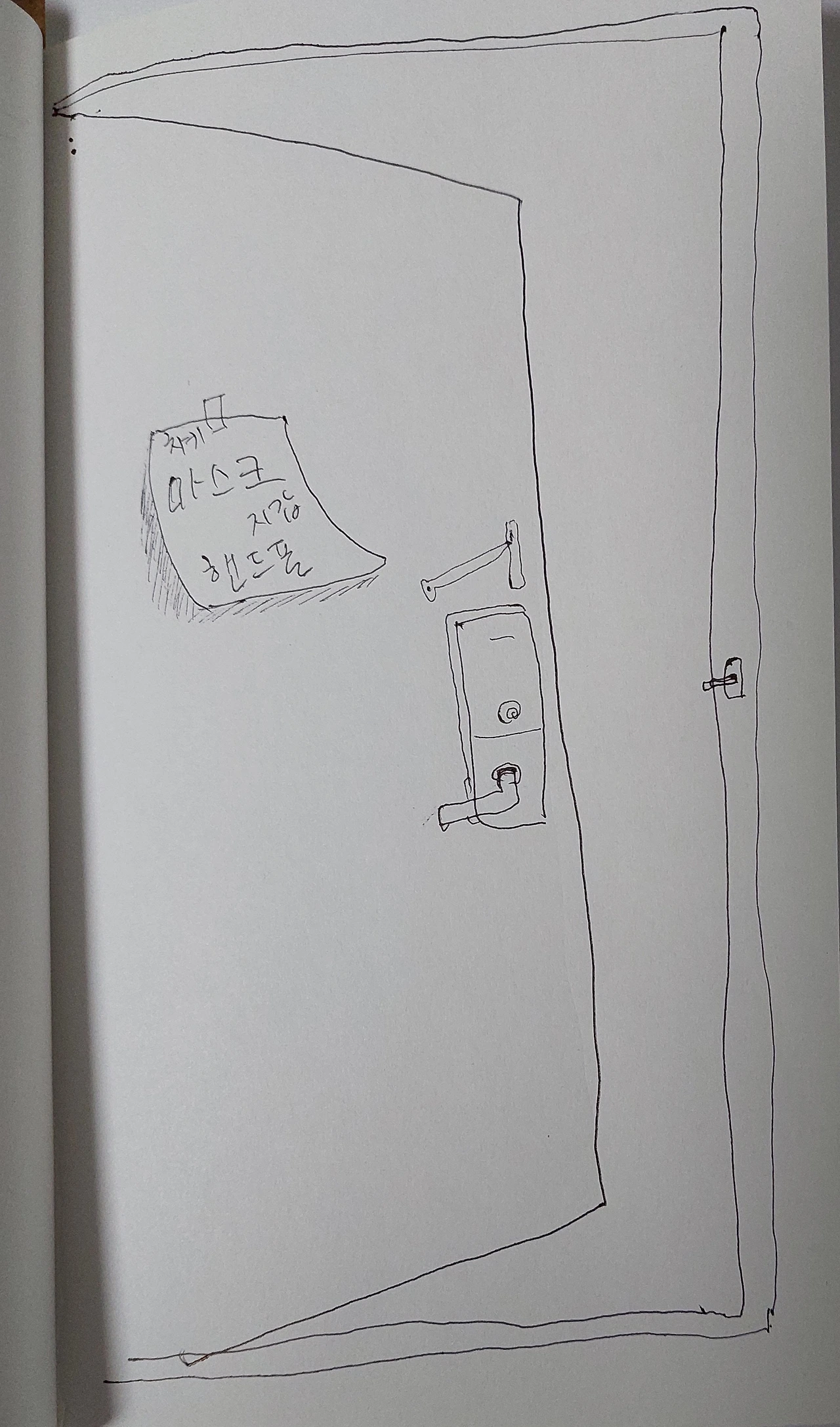 코로나 때 하도 마스크를 잊고 나가서 현관 앞에 메모지를 붙여놓았는데 거기에 날이 갈수록 하나씩 덧붙어가고 이젠 눈여겨보지도 않게 되었다. 그래도 뗄 수는 없는...