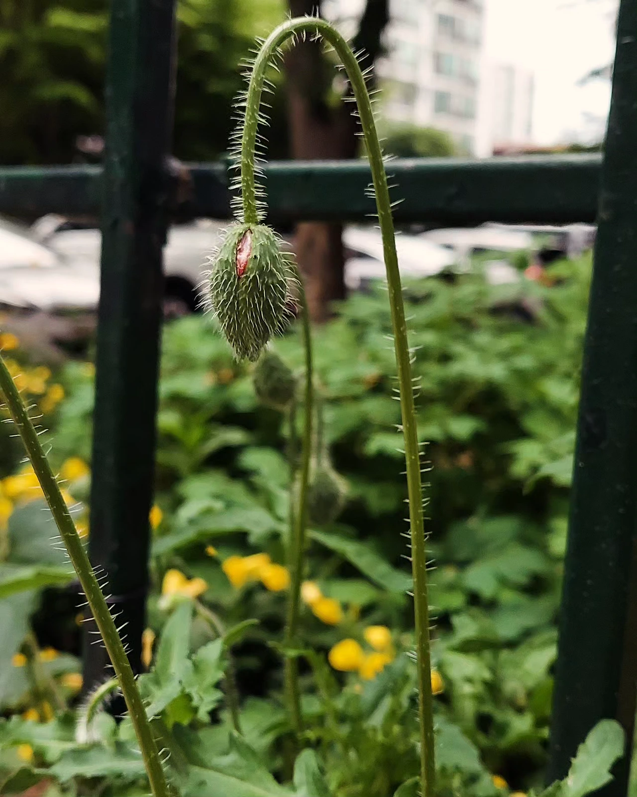 오송송하게 털이 나있는 게 잘 나오도록 사진을 찍고 돌아섰다. 며칠 후면 개화를 할 테니 그때 꼭 봐야지, 하면서. 몇 걸음 걷기도 전에 그 꽃이 활짝 피어있는 걸 보게 되었다. 꽃양귀비. 마약성분이 있는 양귀비와 구분하기 위해 개양귀비라고도 한단다. 줄기와 봉오리에 잔털이 있으면 꽃양귀비이고 털이 없으면 마약성분이 있는 양귀비이다. 주로 붉은 꽃이지만 분홍도 있고 흰색도 있고 흰색과 섞인 것도 있다.