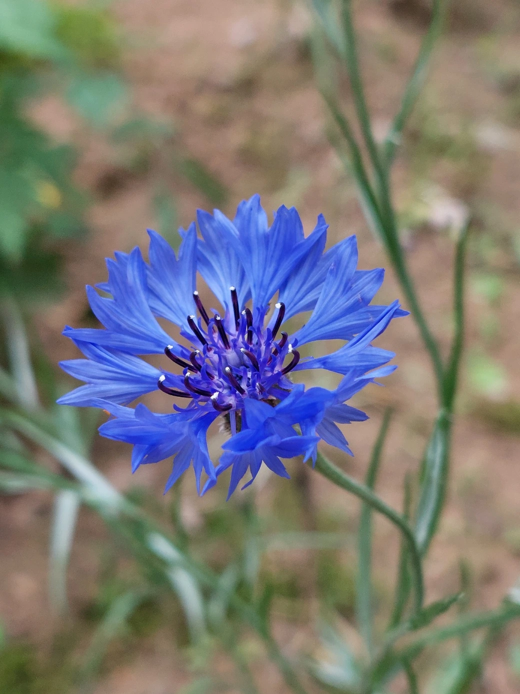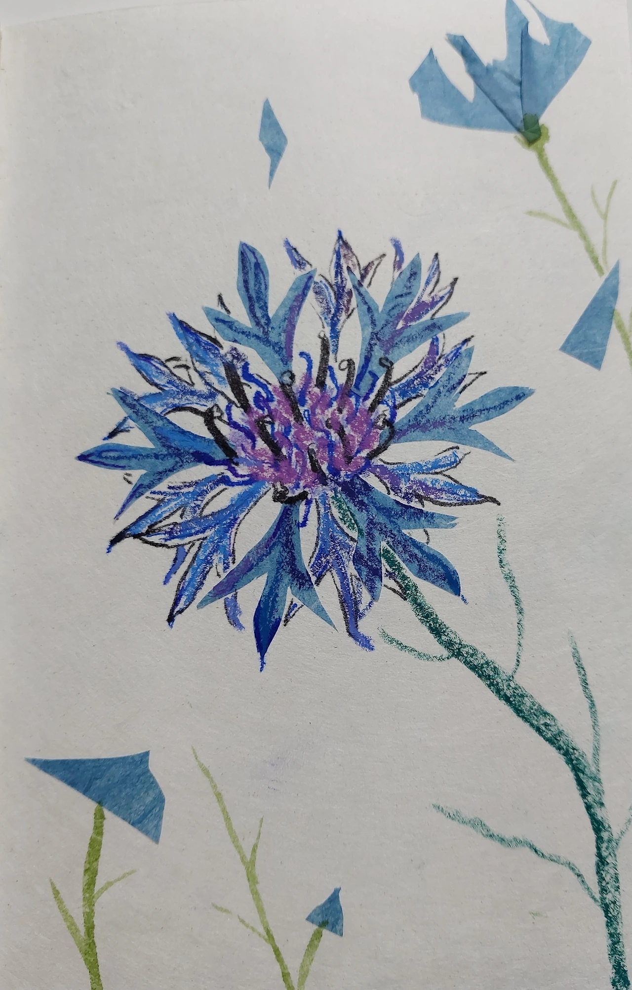 어떤 것은 미처 뿌리를 내리지 못하고 어떤 것은 다행히 자리를 잡더니, 듬성듬성 이기는 했지만 그래도 제법 꽃을 피웠다. 데이지와 금계국, 수레국화 등 오며 가며 눈호강이 되었다. 처음 수레국화를 보았을 때는 종이로 만든 꽃인 줄 알았다. 빨강도 아니고 노랑도 아니고 파랑 꽃이라니. 자연의 색이라기에는 지나치게 선명하지 않은가. 며칠 동안 고민했다. 어떻게 종이 느낌을 살려서 그릴까. 그러다 아예 종이를 오려 붙이기로 마음먹었다. 수레국화 덕분에 어르신에게 언짢았던 마음이 조금 누그러졌다.