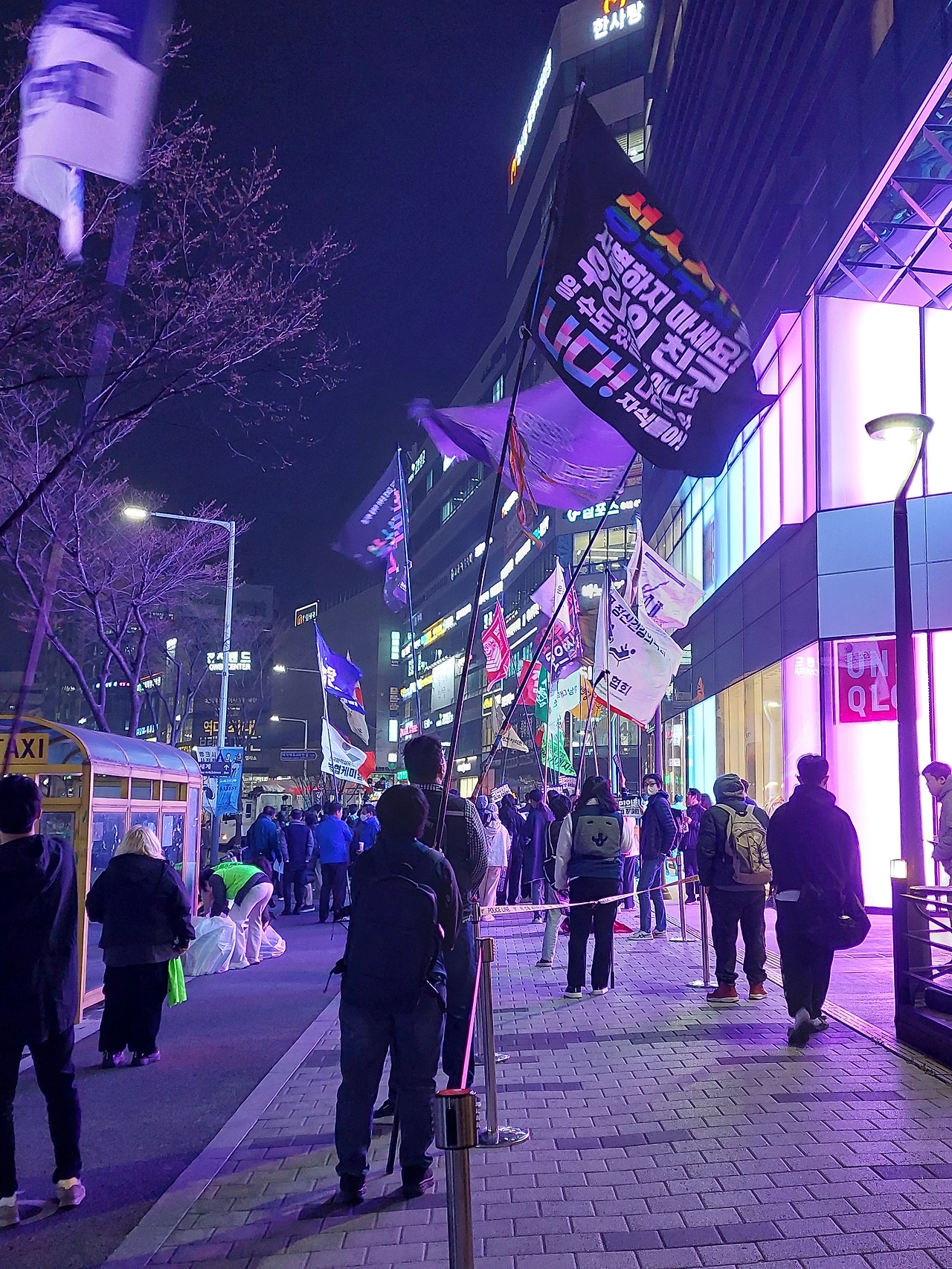 그런데 계엄이 터졌다. 그는 계엄 이전에도 계엄과 같은 상황이 올 거라는 걸 알았다. 계엄을 생각한 건 아니지만, 대통령이 되기 이전부터 불량식품이라도 없는 사람들은 싸게 먹을 수 있게 해줘야 한다는 말을 들으면서 우릴 죽일 수도 있겠다는 두려움을 가졌다. 그는 저소득층으로 국가의 지원을 받고 있었다. 그게 끊기면 한순간에 죽지는 않겠지만 근근이 살아가다가 서서히 죽어가는 거다.